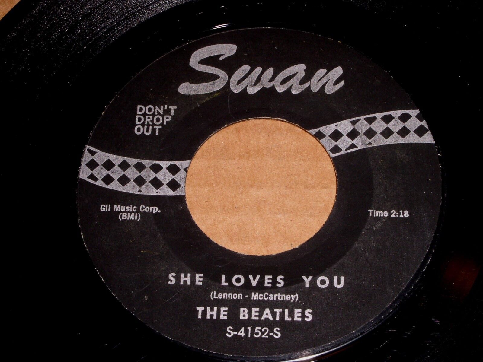 This is an original 45 Rpm phonograph record by The Beatles entitled, "She Loves You". Flipside: "I'll Get You" Label: Swan S-4142.