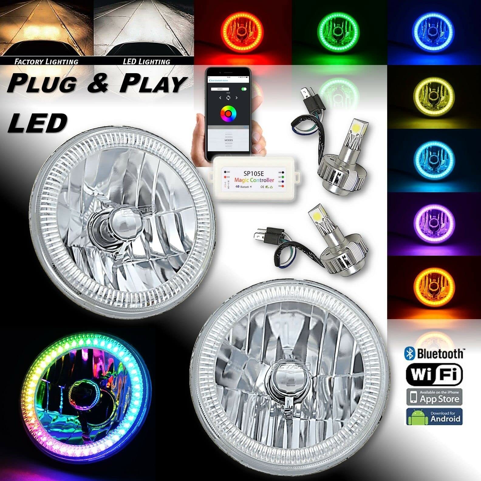 Pair Of New 7 inch Round Headlights Color Chasing RGB 5050 SMD Led Halo Rings Crystal Clear Glass Lenses / Metal Backs 18/24W H4 6500K 3Rd Gen Led Bulbs Included 360 Degree Light Beam Angle High and Low Beam Functions Led Bulbs Work With Factory Wiring Original 3 Prong Plug Design (Plug and Play) Daylight White Brightness Bluetooth 4.0 Controller Interchange: H6024 / 6014 Dot and Sae Approved Qty: 2 (Two) RGB Color Chasing Headlights