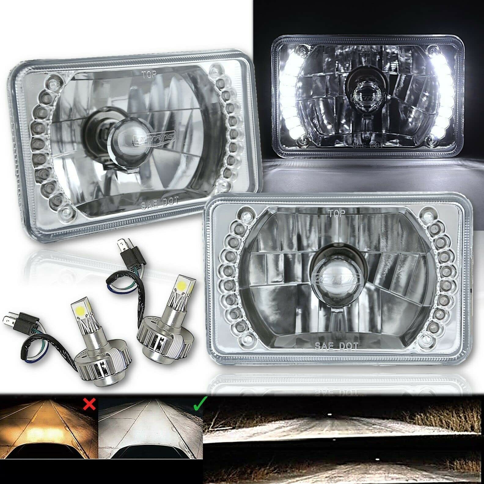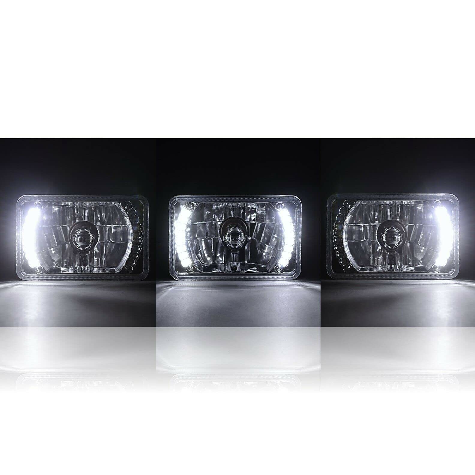 This pair Of 4 - 4X6 Inch Crystal Clear Glass Lens H4 Conversion White Led Split Halo Headlights With 6K White Led H4 Bulbs. This Set Includes (2) Low/High Beam Headlights. These Have The Original Shaped Prongs On The Back So They Will Plug Right Into Your Original Wiring Harness Plugs.