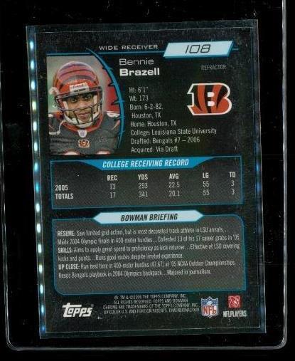 2006 TOPPS BOWMAN CHROME ROOKIE Refractor Football Card #108 BENNIE BRAZELL Cincinnati Bengals
