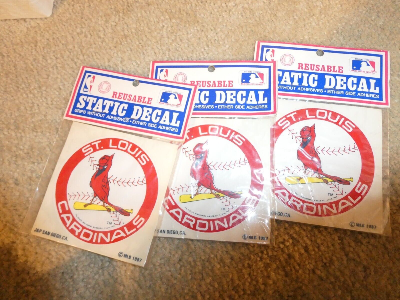 are bidding on a nice, lot of 4 vintage, new old stock, 1987 J P Products, Major League Baseball, St. Louis Cardinals Reusable static decals, in the picture. Each is about 4x4 inches. Zoom in for details.