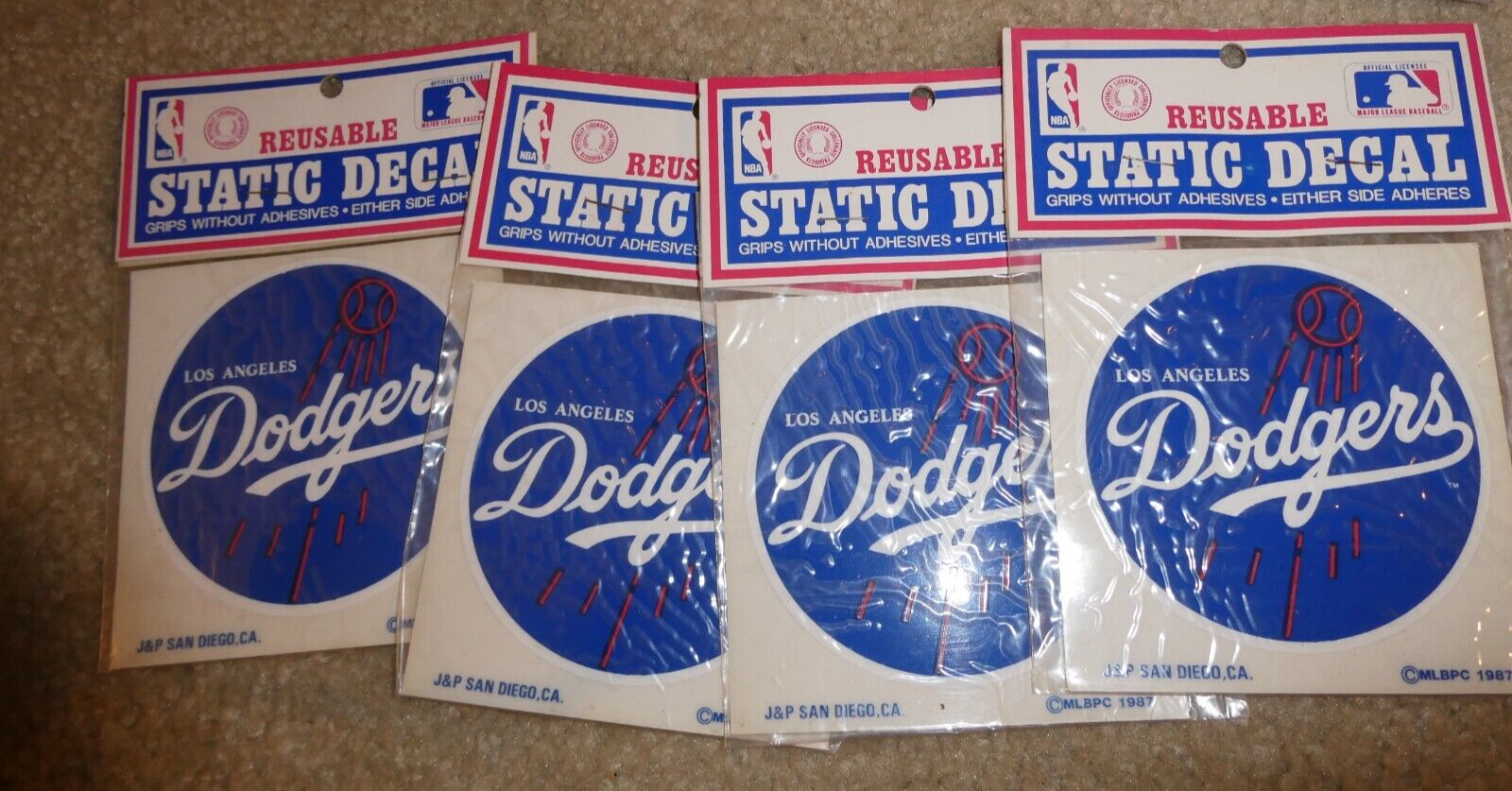 are bidding on a nice, lot of 4 vintage, new old stock, 1987 J P Products, Major League Baseball, Los Angeles Dodgers Reusable static decals, in the picture. Each is about 4x4 inches. Zoom in for details.