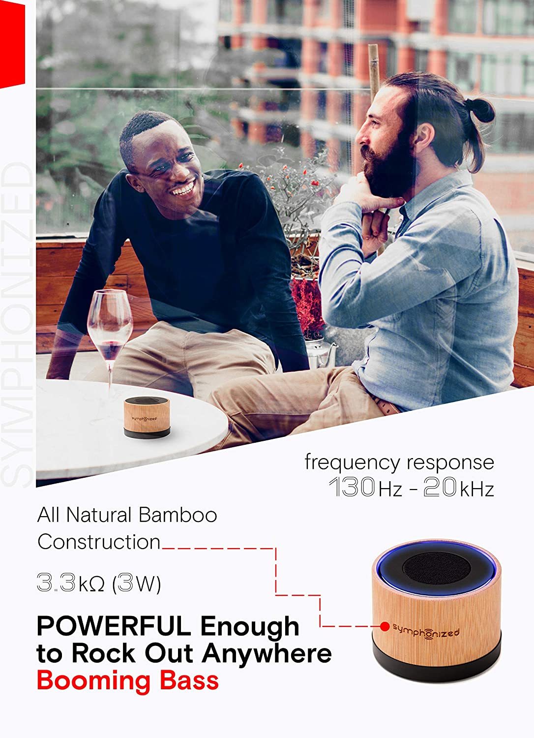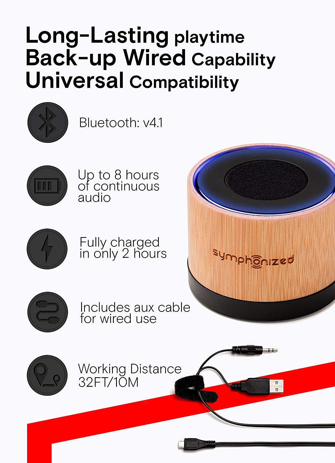 Handcrafted From All Natural Wood Premium High Quality Sound Experience: The Symphonized NXT is handcrafted from one solid piece of real wood. Enjoy the crystal clear acoustics and deep bass response only available through the sound reproduction properties of natural wood. Handcrafted from genuine wood, this speaker is a cut above the rest, providing sound that will be the highlight of your backyard get together, while still being small enough to fit into your backpack or purse. Quick To Connect And Easy To Use: Simply power on you are instantly in pairing mode and ready to connect. It?s that simple, you are good to go! Universally compatible with any Bluetooth capable device, the portable wood speaker connects in seconds and has all necessary function controls at your fingertips. Control volume and skip tracks from up to 33 ft away from your connected device Incredible Play Time: Enjoy up to 6 hours of wireless play time on a single charge; Go from drained to a full charge in under two hours! The Symphonized NXT Wireless Speaker ensures the party never gets cut short! Aux cable included for wired use. What's Inside: NXT Portable Bluetooth Wood Speaker, eco-friendly carrying pouch to keep your speaker safe and scratch free, Tangle Free Aux/micro USB dual Cable 4.1 Bluetooth Capability: Compatible with all generations of iPhones, iPods, and iPads. Also works with all Androids, tablets, mp3 players, CD players, and related audio devices. 1 Year Limited Warranty: Enjoy USA Based Customer Service and a One Year Hassle Free Limited Warranty