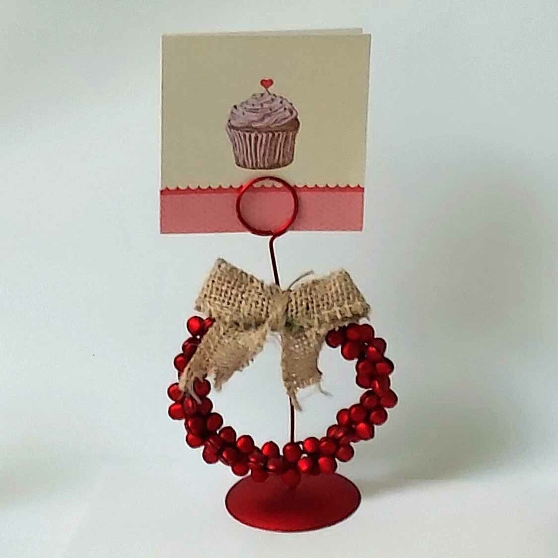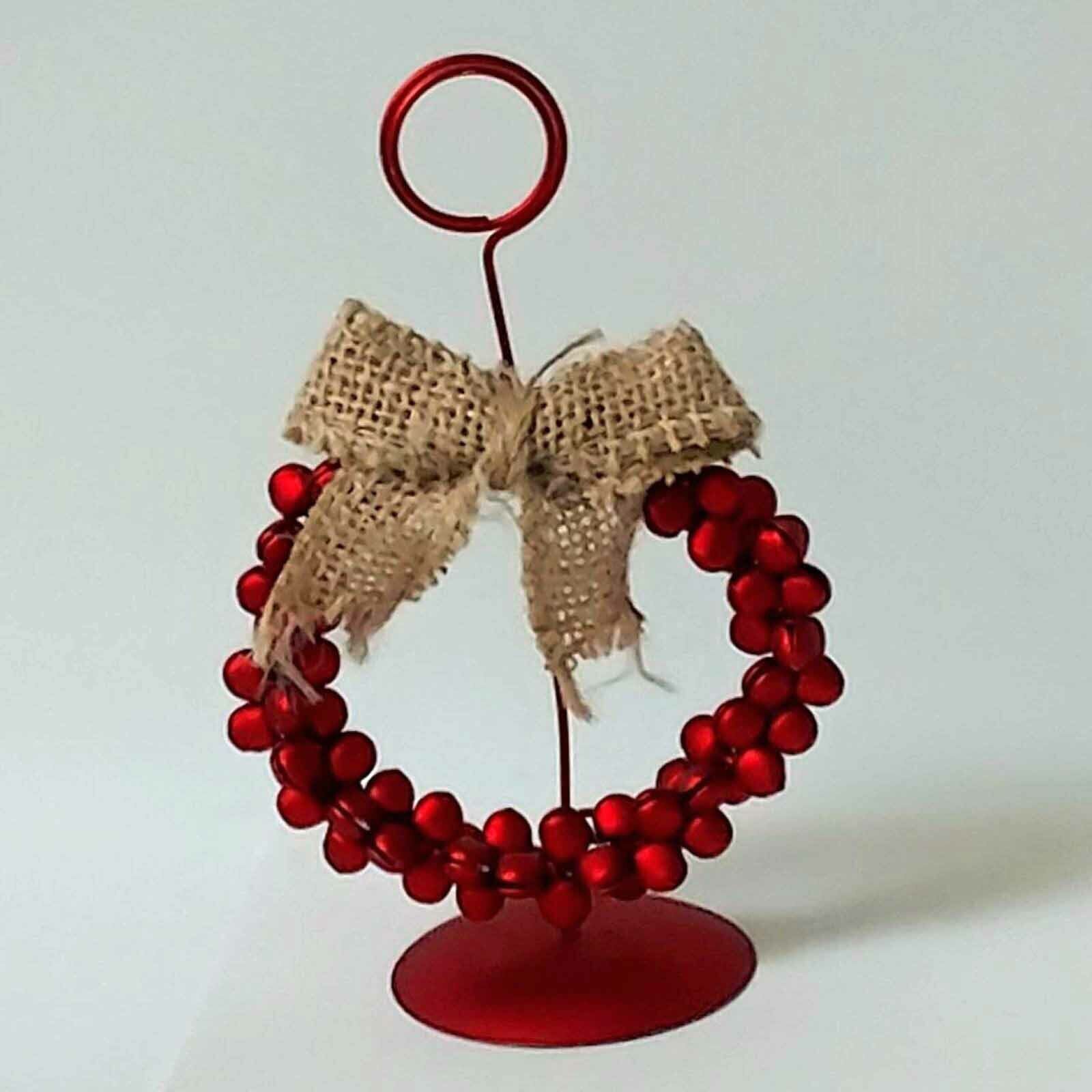 The red bell metal wreath measures 5.5 inches tall x 3 inches wide with a burlap ribbon