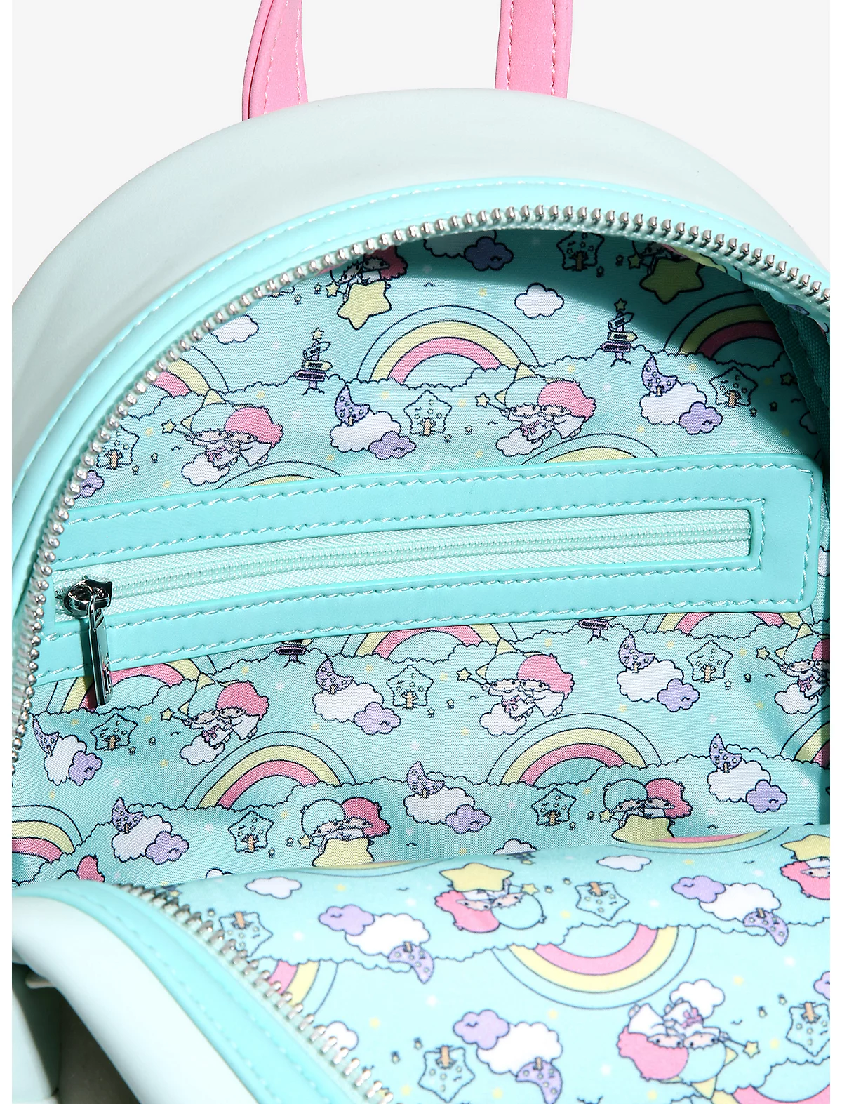 Kiki and Lala always have each other's backs, and now they have yours too! The Little Twin Stars peek out from behind a cloud-shaped applique zip pocket on this faux leather Loungefly mini backpack, surrounded by whimsical graphic and embroidered details. You'll shine like the Omoiyari Star when you rock this super cute Sanrio accessory, which also features dreamy patterned interior lining with a zip pocket, as well as adjustable straps with a rainbow pastel colorway.