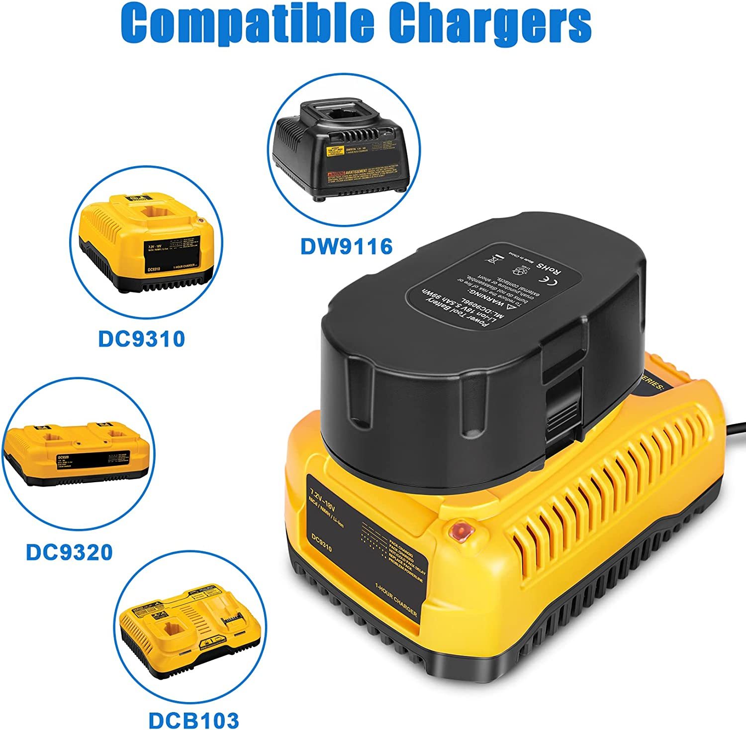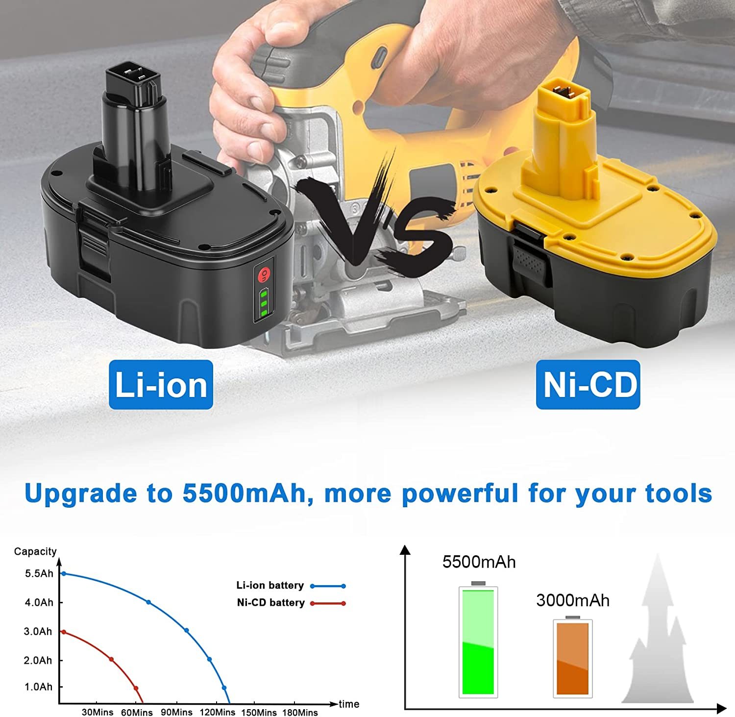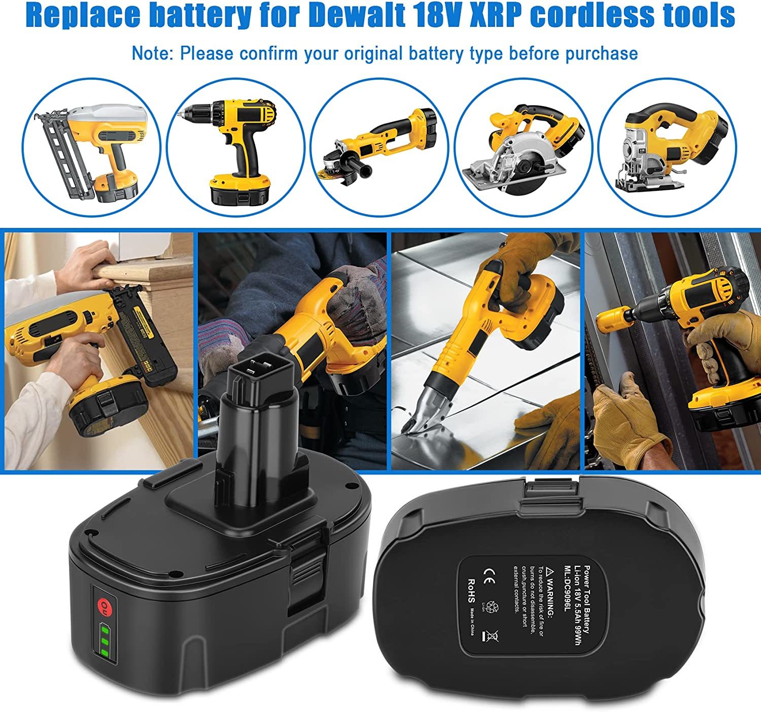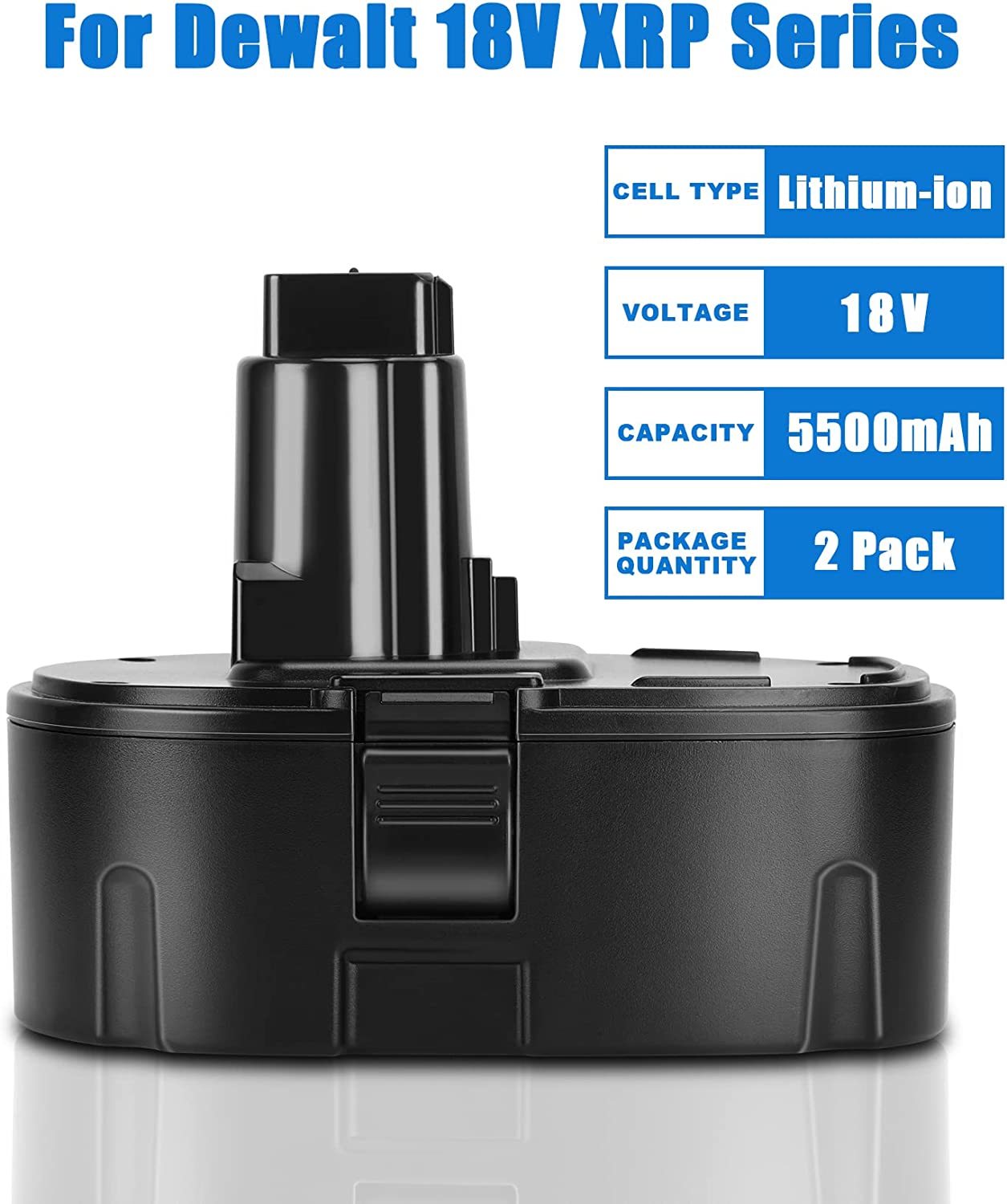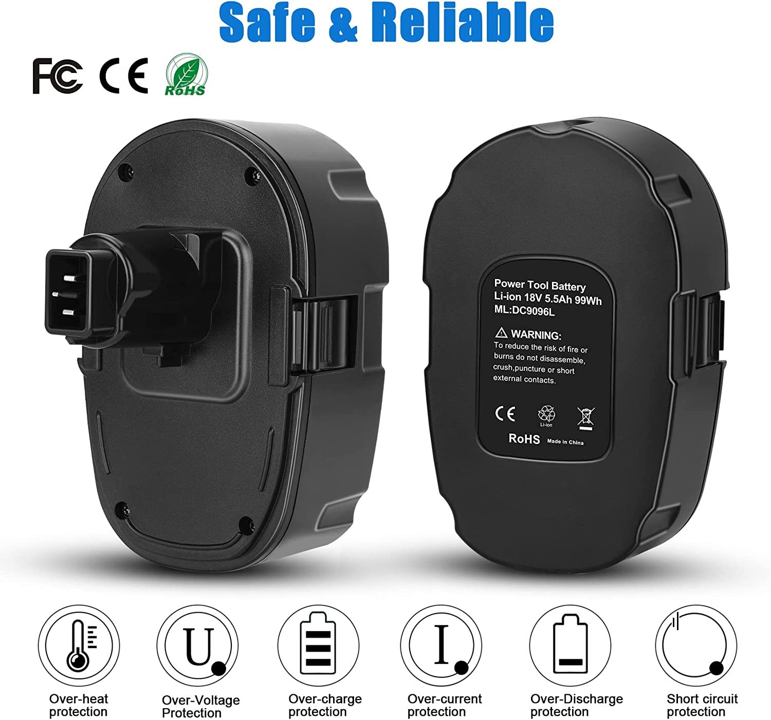 ?2-Pack Replacement 18V Battery Model: DC9096 | Cell Type: Lithium-ion | Voltage: 18-Volt | Capacity: Upgrade to 5500mAh | Removable Rechargeable | A longer duration and more powerful than the original batteries. ?Fully compatible with DEWALT 18V cordless tools and original chargers, including DC9096 DC9098 DC9099 DE9039 DE9095 DE9096 DE9098 DW9095 DW9096 DW9098 DW9099 DE9038 DE9503 DC9182 DW9116 DC9310 (NOT compatible with DW9226 charger) ?Integrated LED battery level indicator allows user to monitor battery using. No memory effects, can be charged or discharged as needed without loss of capacity. Offers long-lasting performance and durability. ?Safety Reliable: All KUNLUN batteries have complied with CE, FCC, ROHS certified and standards, built-in over-charge, over-discharge, over-voltage, over-current, and over-heating protection (Please note that it will stop if it's too hot, please wait for it cooling down). ?Product Guarantee: We provide 30 days money back guarantee/12 months limited warranty. Any problem, please feel free to contact us. Please click the "Ask a question" on our storefront or in "YOUR ORDER" options click the "contact seller".