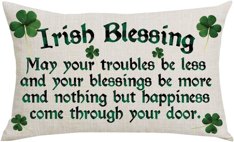 WENIANRU Green Black Plaid Inspirational Quote Irish Blessing May Your Troubles Be Less And Your Blessings Be More And Nothing But Happiness Come Through Your Door Clovers Happy St. Patrick's Day Spring Home Sofa Chair Bed Decoration Lumbar Pillowcase Cotton Linen Decorative Throw Pillow Cover Case Rectangular 12 x 20 Inches Size: 12 x 20 Inches, 30 x 50 cm. There may be an error of 1-2 cm. It's just a pillow cover, the pillow insert is not included, the zipper is hidden. It's just printed on one side, if you want it printed on both sides, please e-mail us. It can decorate your home, living room, bedroom, sofa, chair, bed, car and so on.