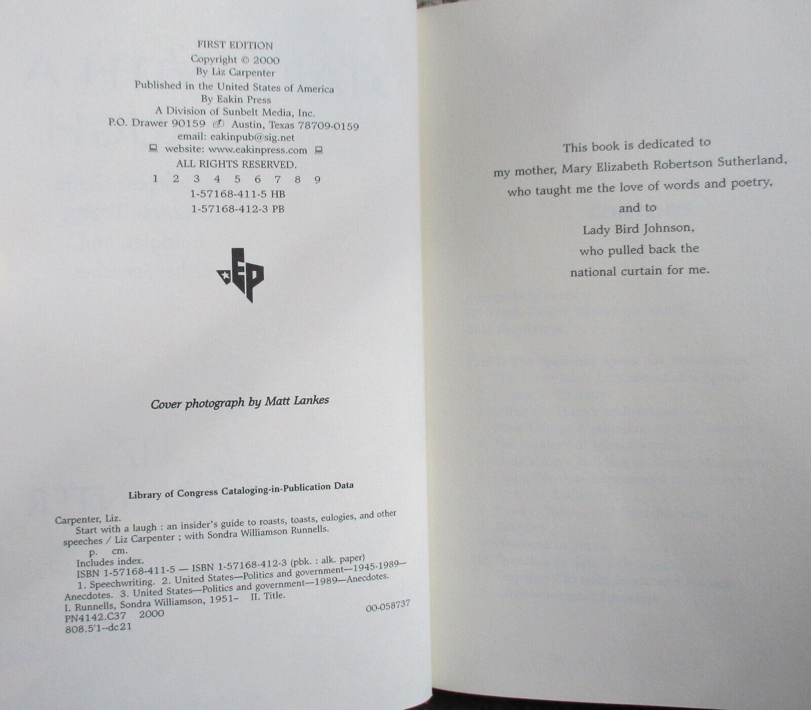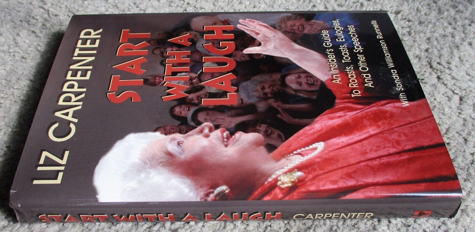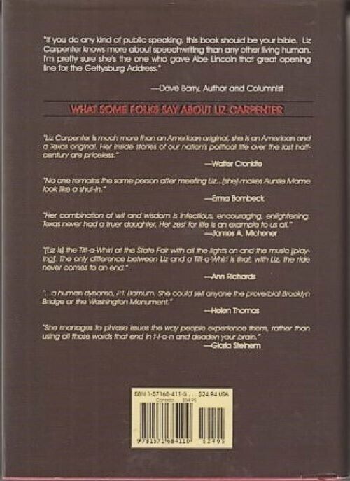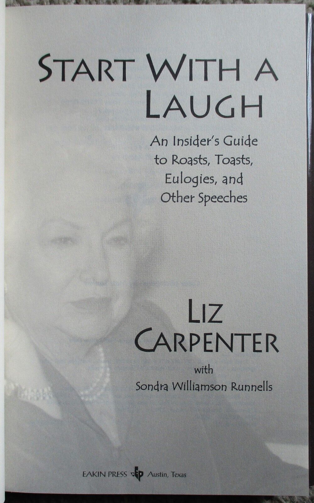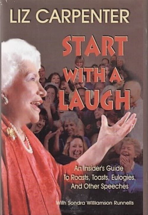 6.5" x 9.25", 272 page hardcover with dustjacket titled START WITH A LAUGH: AN INSIDER'S GUIDE TO ROASTS, TOASTS, EULOGIES. AND OTHER SPEECHES by Liz Carpenter with Sondra Williamson Runnells/ Eakin Press, ISBN # 1-57168-411-5, First Edition, First Printing, Copyright 2000/ You would think that a book about speechwriting, speechmaking, and speeches would put you to sleep. On the contrary, it is laugh-out-loud funny with a few tears thrown in, in addition to being very instructional. It also covers fifty-odd years of Liz's association with American political figures, background on some important historical events, and a wealth of personal anecdotes about her life.