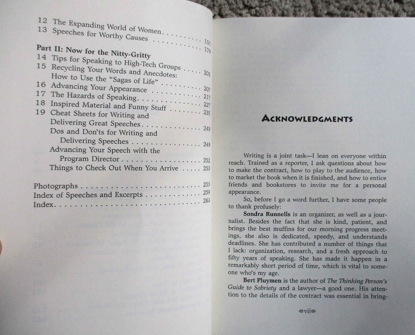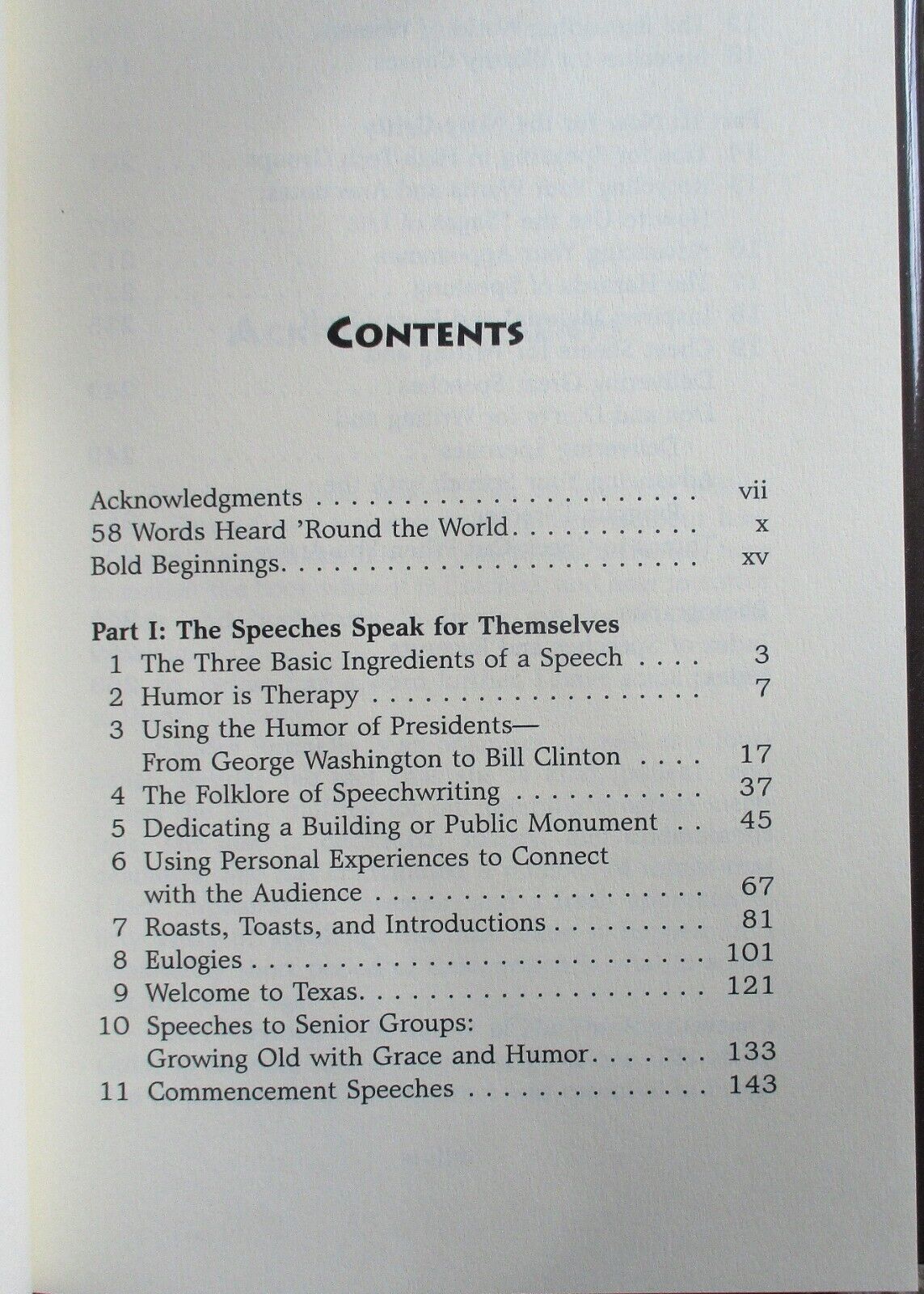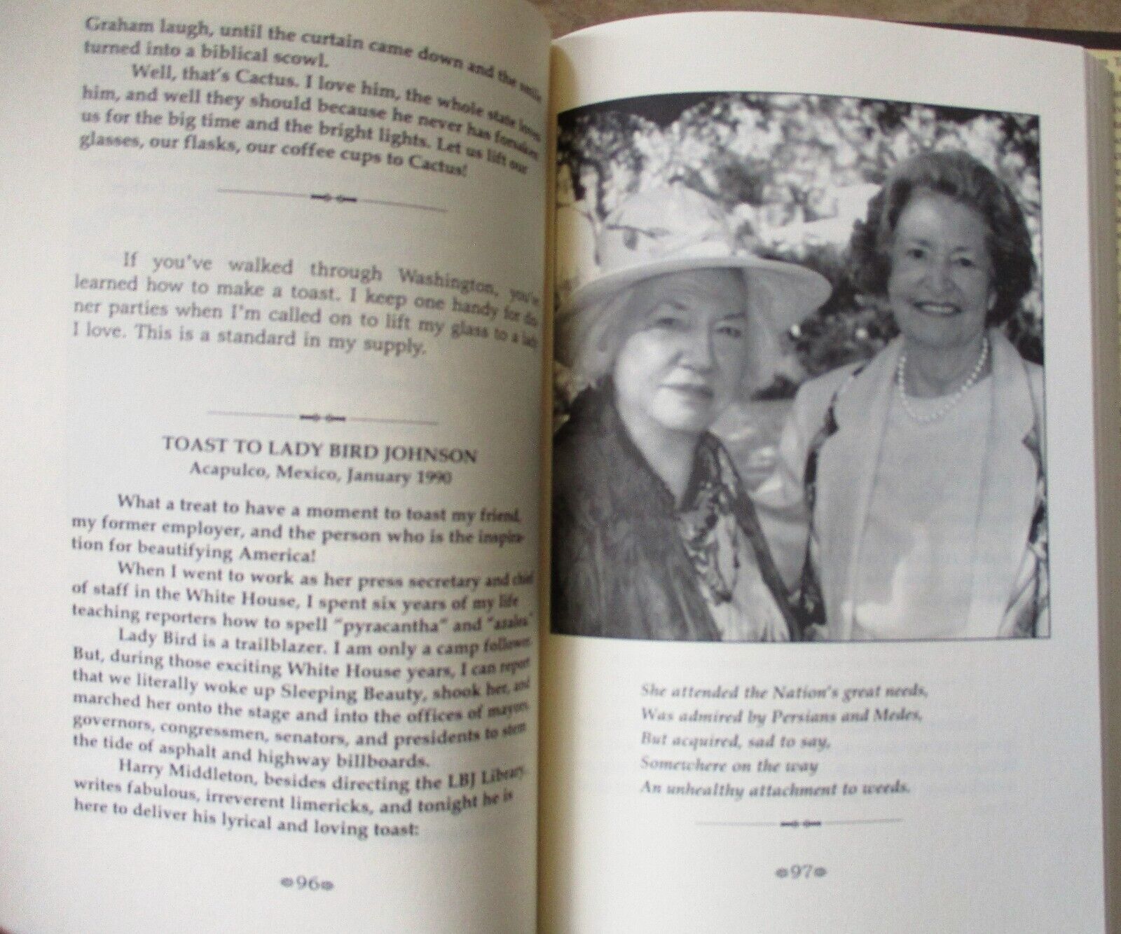 6.5" x 9.25", 272 page hardcover with dustjacket titled START WITH A LAUGH: AN INSIDER'S GUIDE TO ROASTS, TOASTS, EULOGIES. AND OTHER SPEECHES by Liz Carpenter with Sondra Williamson Runnells/ Eakin Press, ISBN # 1-57168-411-5, First Edition, First Printing, Copyright 2000/ You would think that a book about speechwriting, speechmaking, and speeches would put you to sleep. On the contrary, it is laugh-out-loud funny with a few tears thrown in, in addition to being very instructional. It also covers fifty-odd years of Liz's association with American political figures, background on some important historical events, and a wealth of personal anecdotes about her life.