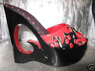 New with box beautiful black and red lacquer 6 inch (with a 2 inch rise in front) cutout platform mules with cherries and hotrod flames in a size 7 (which should fit: 37 UK4.5) All shoes brands run differnt so please know your size in this brand. Awesome! Perfect for Viva Las Vegas! The right shoe has light scuffs on the sole as it was display shoe.The white spots are from my flash...not chips. One shoe has some black over-spray on the red cut-out section. Not very noticeable, but it is there. Might be able to fix at a shoe repair store or with some nail poish.They came from the factory that way.I love to shop and I'm closet cleaning the stuff I didn't wear so I have room for new. I will be listing designer fashions all month.Please ask all questions before bidding as all sales are final. I will combine shipping for multiple purchases. Yee Haw! Remember that I am on the West coast of the US so shipping to the East coast and foreign countries can take a week longer. I try to ship out the first business day after you pay and I always provide you tracking info at that time so you may see where your purchase is. I can not be responsible for the the length of time it takes to reach you once it leaves my hands. Thanks for understanding.