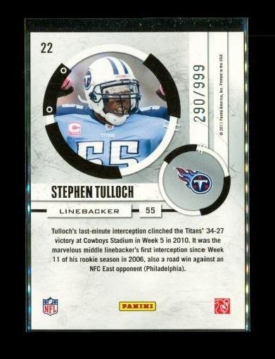 2011 DONRUSS ELITE HIT LIST Chrome Football Card #22 STEPHEN TULLOCH Tennessee Titans Limited Edition 290/999