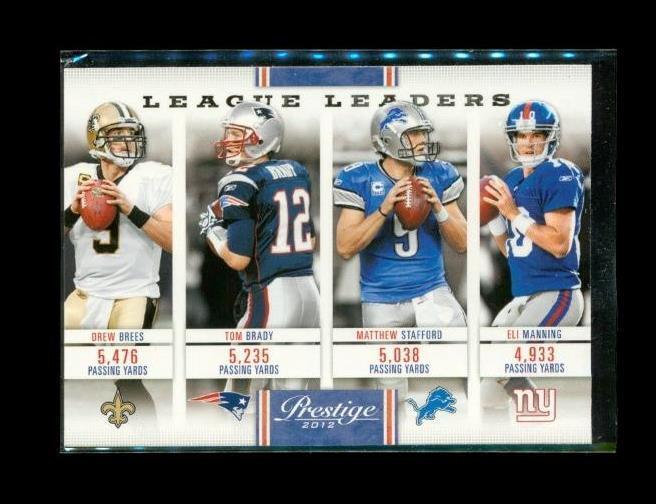 2012 PANINI PRESTIGE LEAGUE LEADERS Quadruple Football Card #16 DREW BREES New Orleans Saints, TOM BRADY New England Patriots, MATTHEW STAFFORD Detroit Lions, ELI MANNING New York Giants