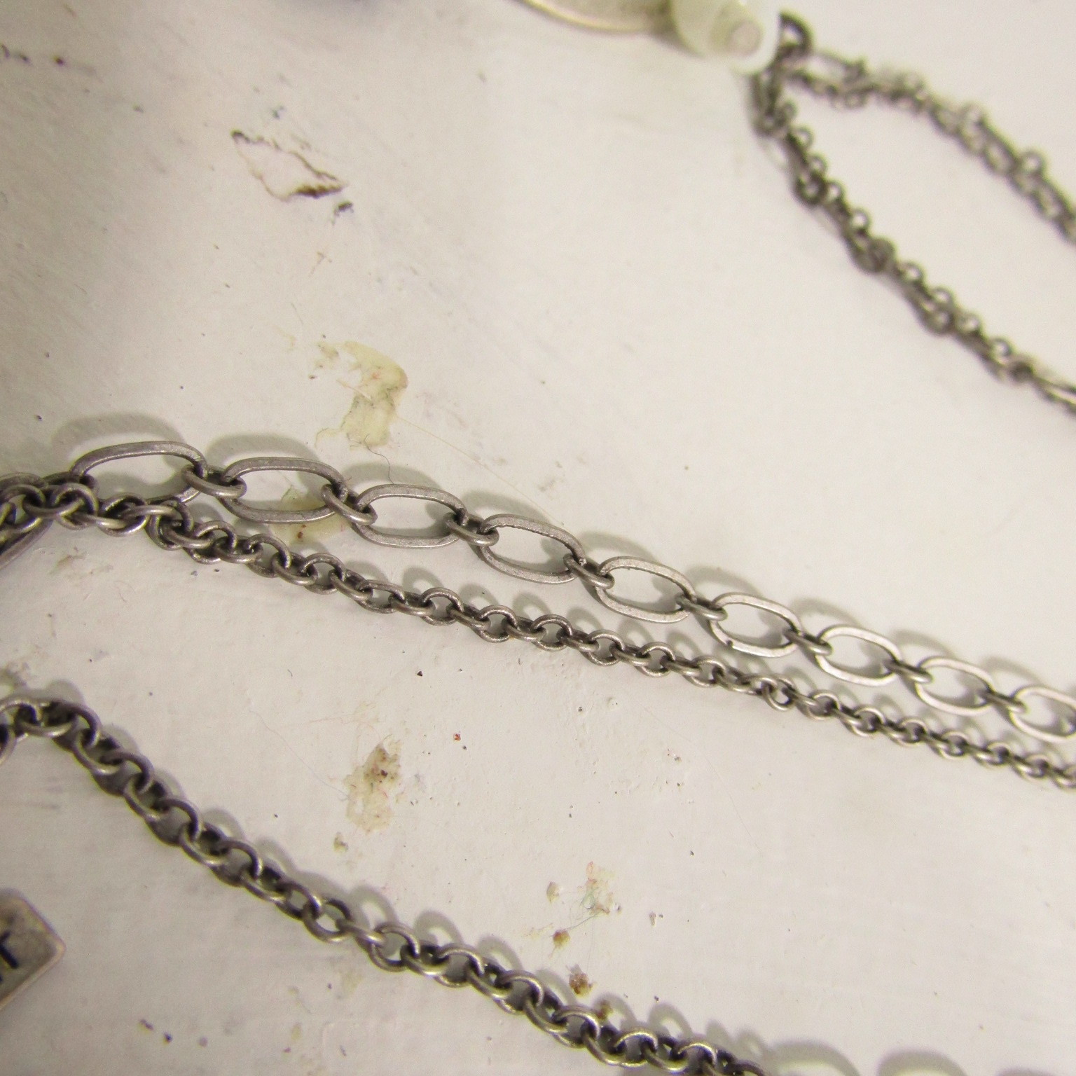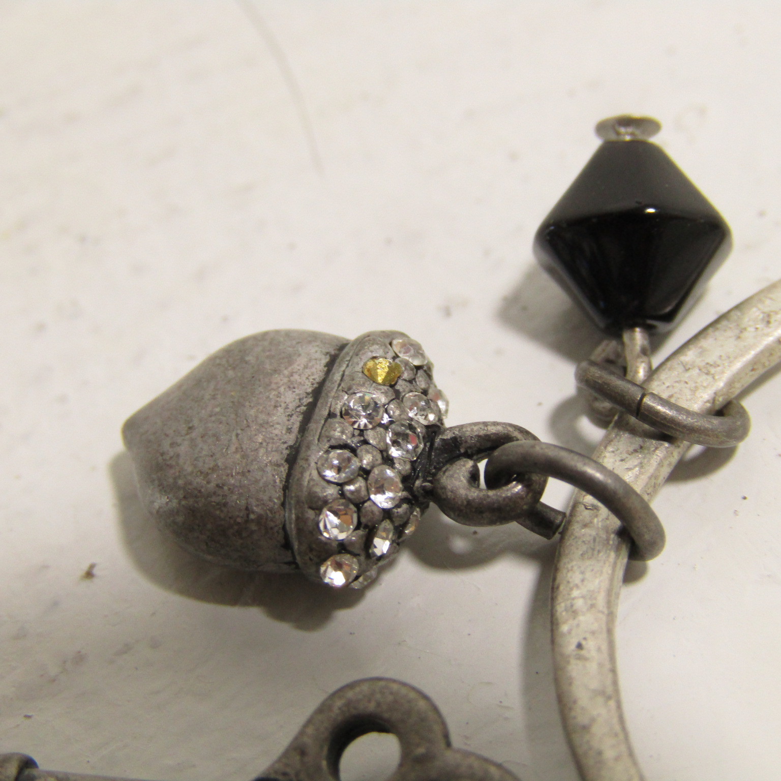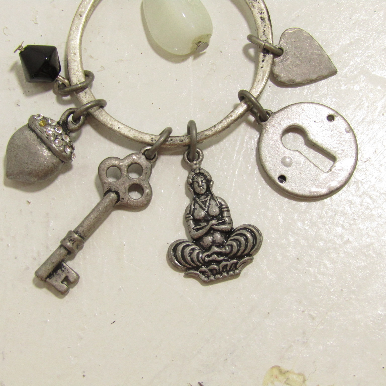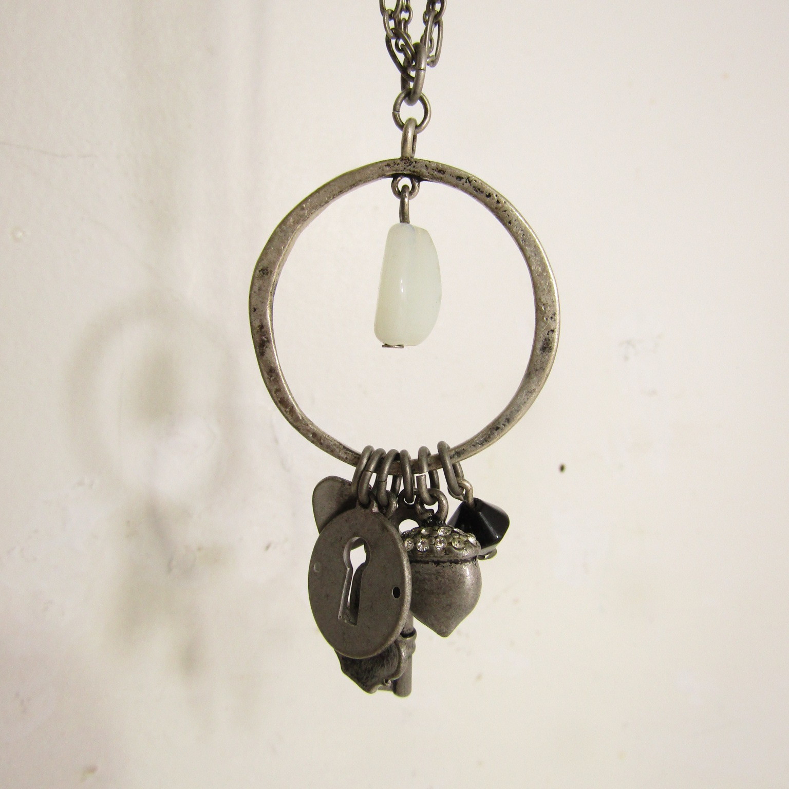 This is a double-strand cable chain necklace with charm holder that holds grey charms including a zen Buddha, lock, key, acorn with 1 gemstone missing, heart, and black plastic octahedron.