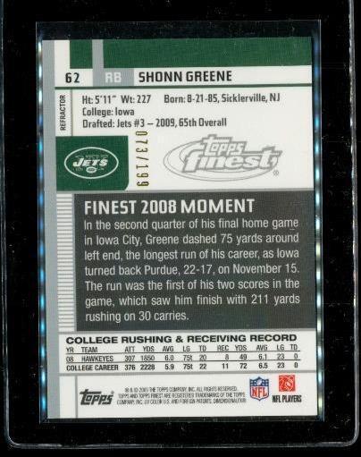2009 TOPPS FINEST ROOKIE Refractor Football Card #62 SHONN GREENE New York Jets Limited Edition 073/199