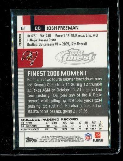 2009 TOPPS FINEST ROOKIE Refractor Football Card #61 JOSH FREEMAN Tampa Bay Buccaneers