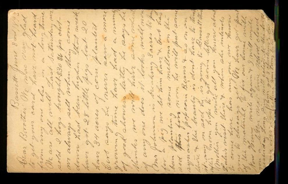 1893 Postcard Letter Bassett Virginia to Michigan BROOKS Family Genealogy - the letter is from Henry Brooks sister on the family farm in Bassett, VA. She talks about crops, hogs, what they are planting and the prices of the time.