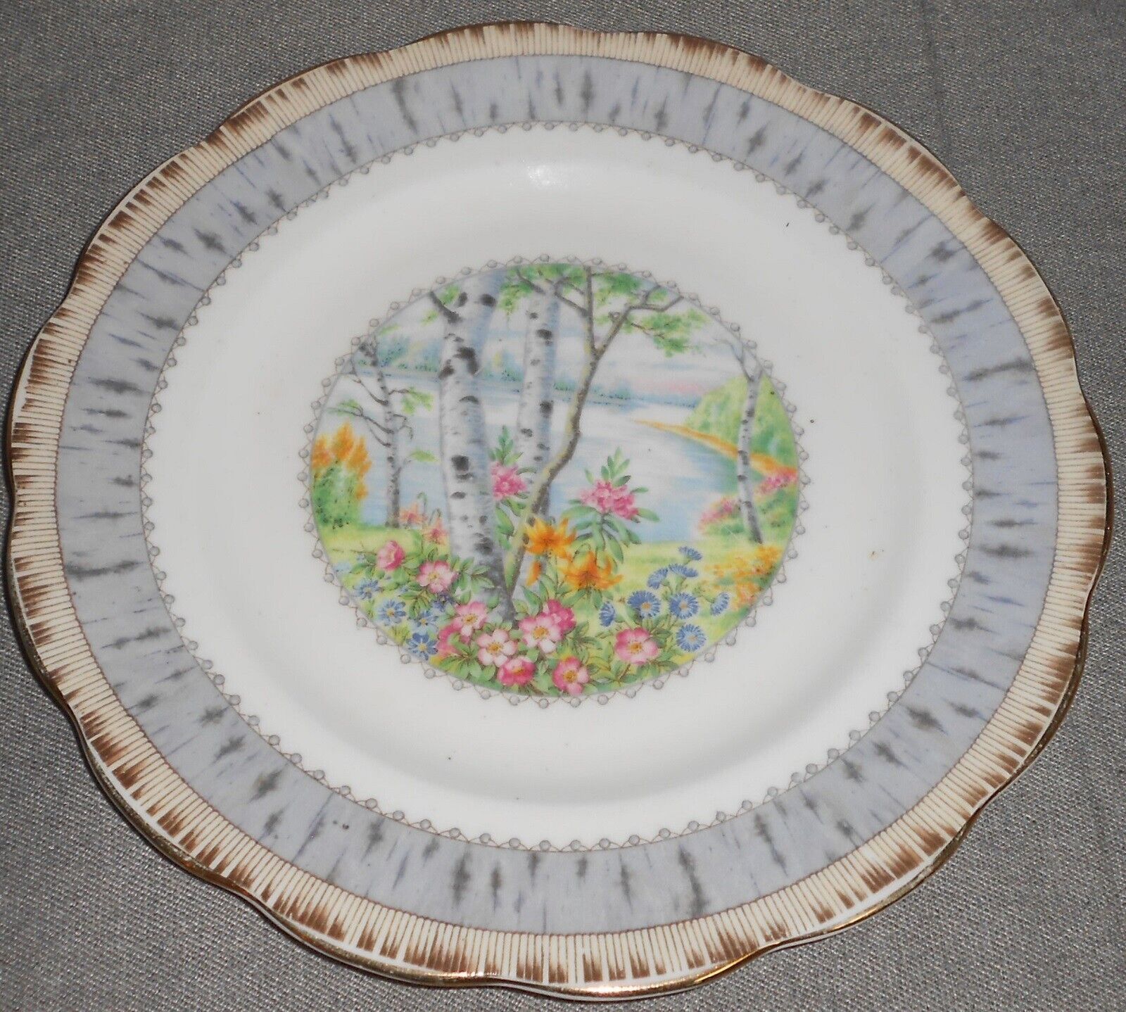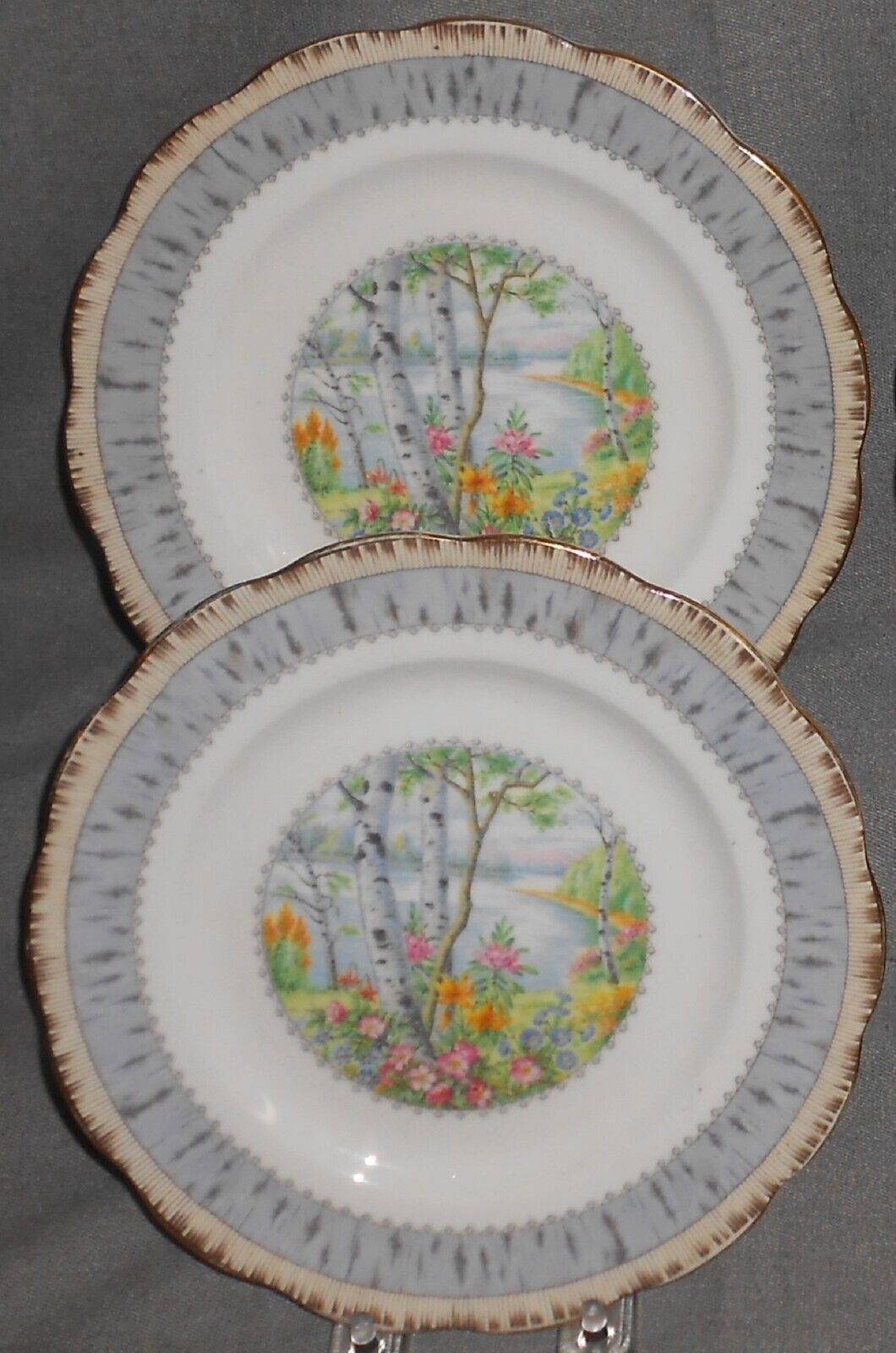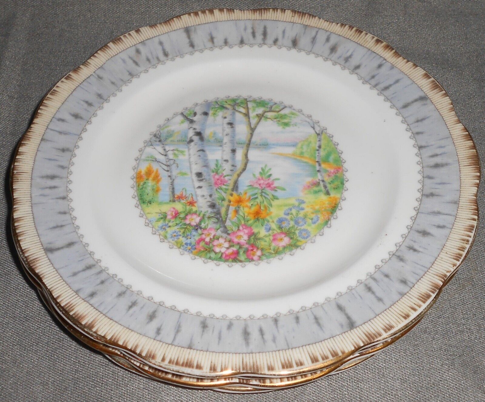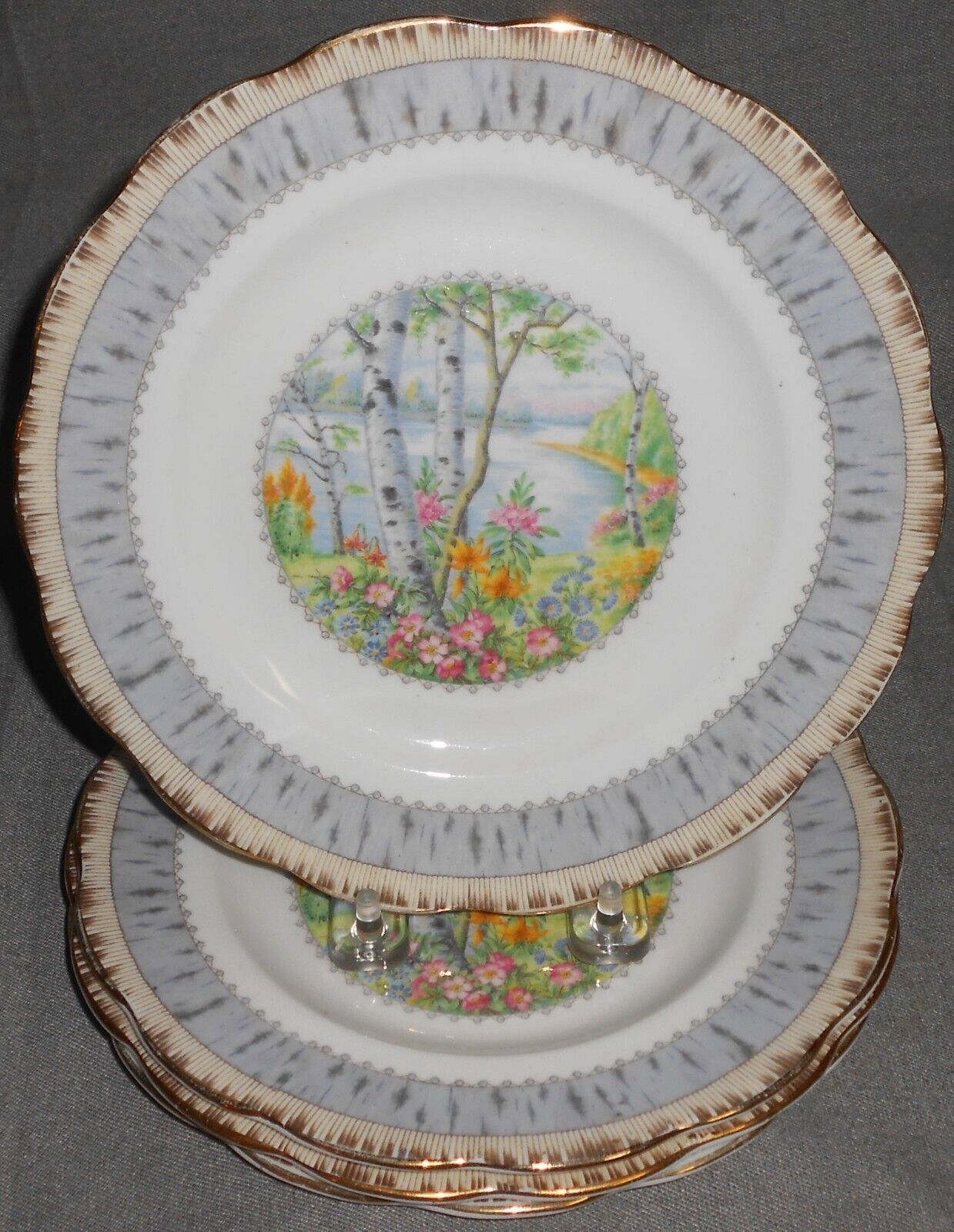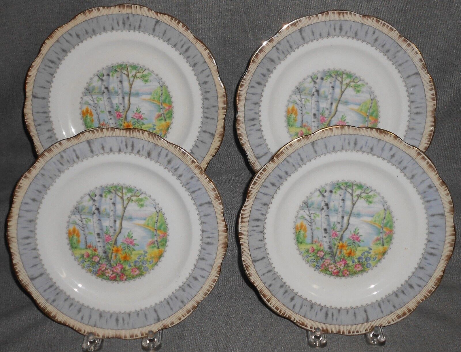This is a Set of (4) 8" Bone China Salad Plates from Royal Albert in the Silver Birch Pattern and Made in England. They are all in good pre-owned condition with no chips or cracks.