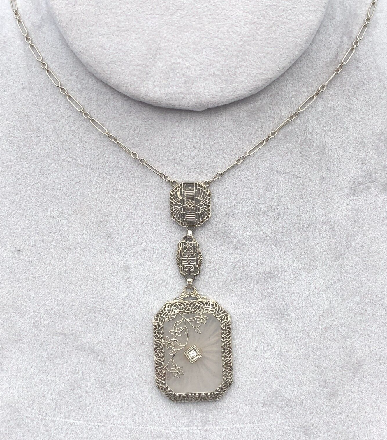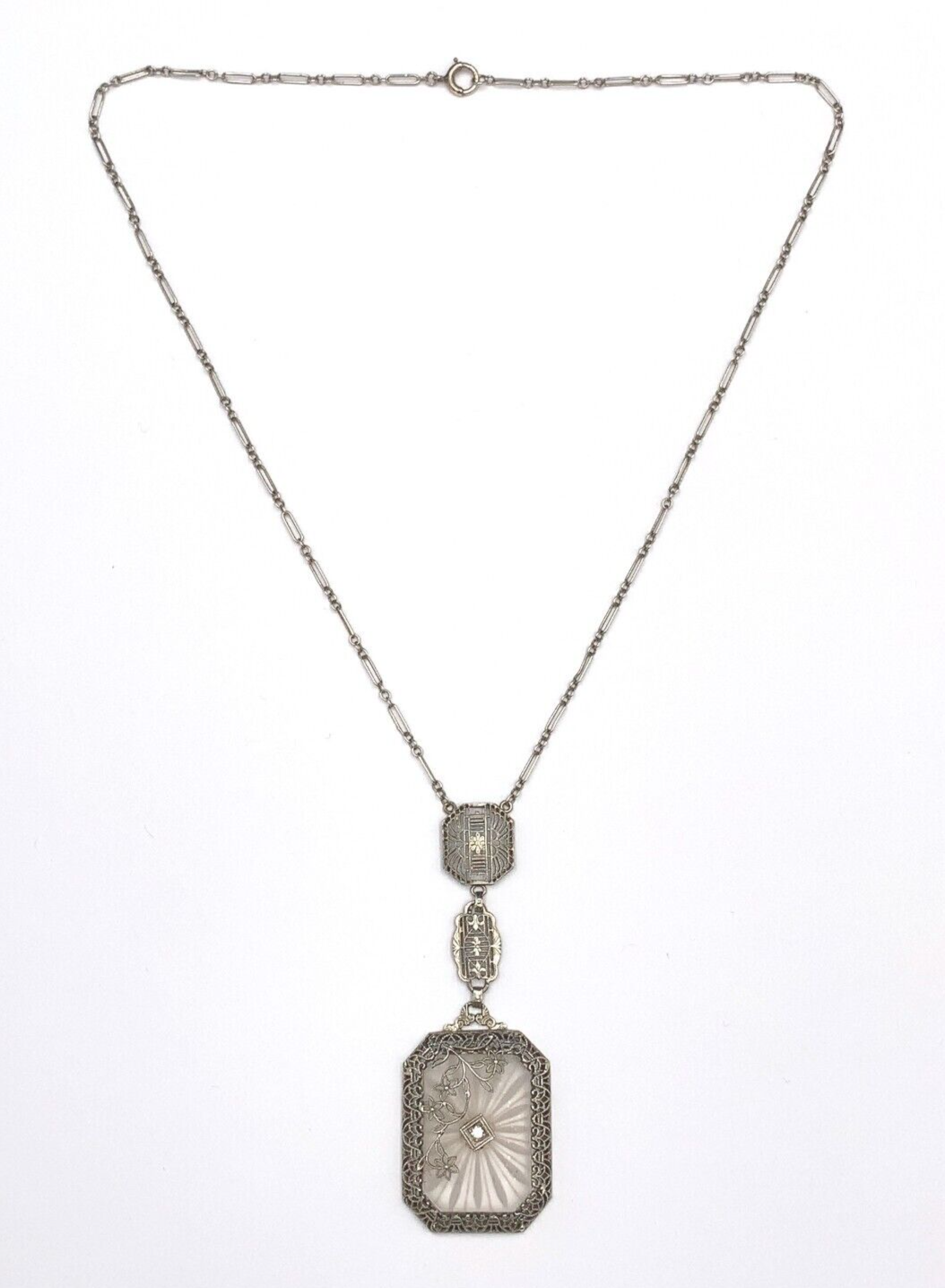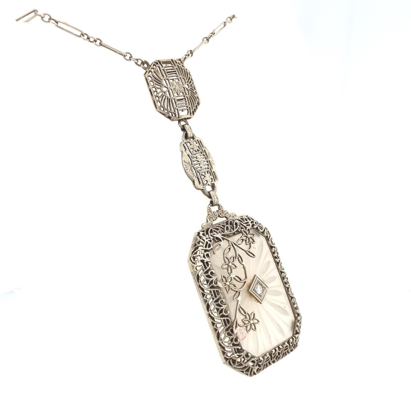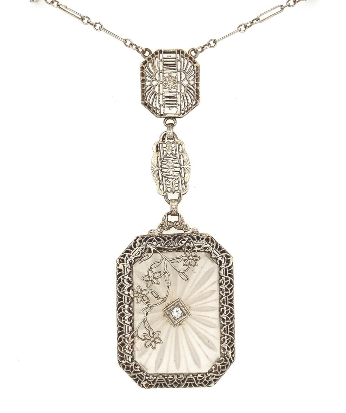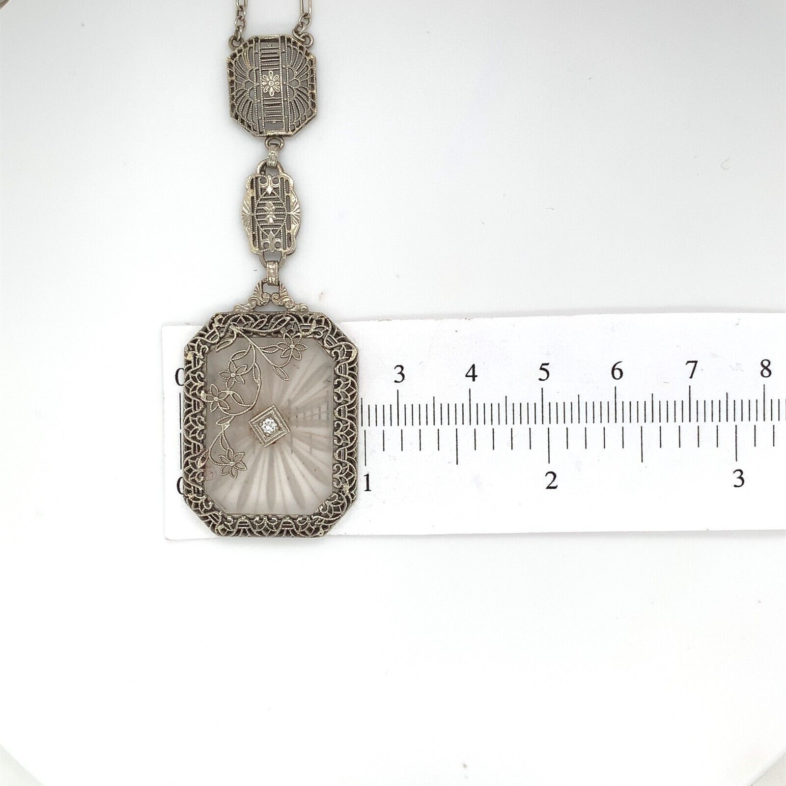 Art Deco 14k white gold pendant featuring a beautiful frosted and reverse carved rock crystal quartz panel. The crystal is accented with a small round diamond and extra filigree in the border and flowers on the top. The quartz panel measures about 24mm x 19mm, and the diamond measures about 2.2mm. There are two filigree links and the original Deco paperclip chain.