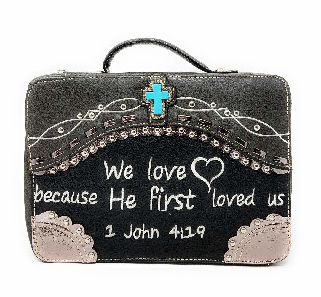 Product description: Texas West Embroidery Scripture Concealed Carry Bible Verse Rhinestone Cross Agate Stone Cross Handbag Wallet Set in 4 colors Fits Most Bibles.Height: 10.25" Length: 7.5" Depth: 3" Handbag Size:13'' x 9'' x 5'' Wallet Size:7.5" x 4.5" x2" Outer Material: Synthetic. Outlined with embroidery cut-out pattern and rhinestones. Top Handle/Wrap Around Zipper/Zip and Slip Pockets Inside w/Lined Interior Embroidered Scripture Bible Verse With Floral Same business day shipping and handling