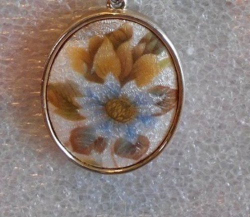 This is a unique one-of-a-kind keychain (or key ring) made by a local artist. The materials used include: Painted on metal broach thats mounted on gold-tone metal, measures about one and a half-inches. The silver-tone chain is about two inches, and the plastic and crystal beads are about half inch, and the metal keyring is about an inch. Overall length is about 5 inches.
