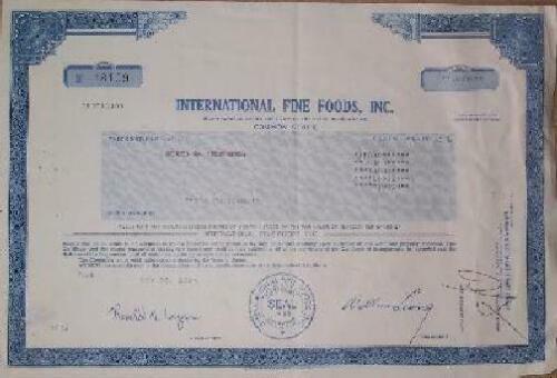 International Fine Foods Stock Certificate, 1984 Very Rare Vintage Scripophilly