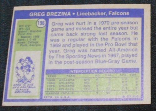 1972 Topps Greg Brezina Atlanta Falcons 196 NFL Football Sports Card, RARE Error