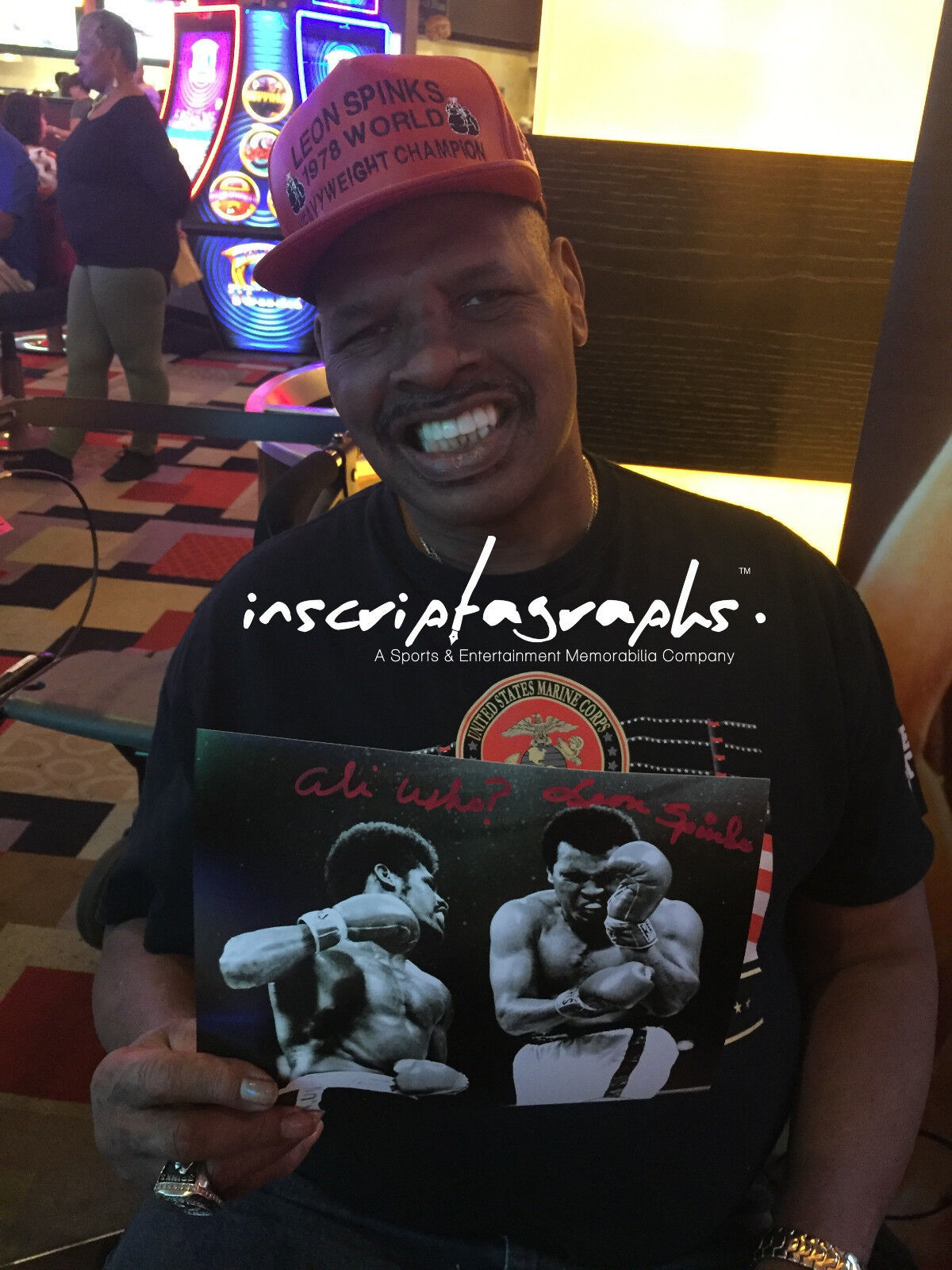 LEON SPINKS SIGNED 8X10 PHOTO INSCRIBED "ALI WHO?"! THIS IS AN INSCRIPTAGRAPHS EXCLUSIVE INSCRIPTION AND YOU CAN ONLY GET IT HERE FROM US! NEVER HAS HE WRITTEN THIS BEFORE, A MUST HAVE FOR BOXING COLLECTORS FROM ONE OF THE BIGGEST UPSETS EVER IN BOXING HISTORY!!! THIS ITEM IS AUTHENTICATED BY INSCRIPTAGRAPHS AND WAS SIGNED ON NOVEMBER 13, 2016 AT OUR SIGNING WITH LEON IN LAS VEGAS.