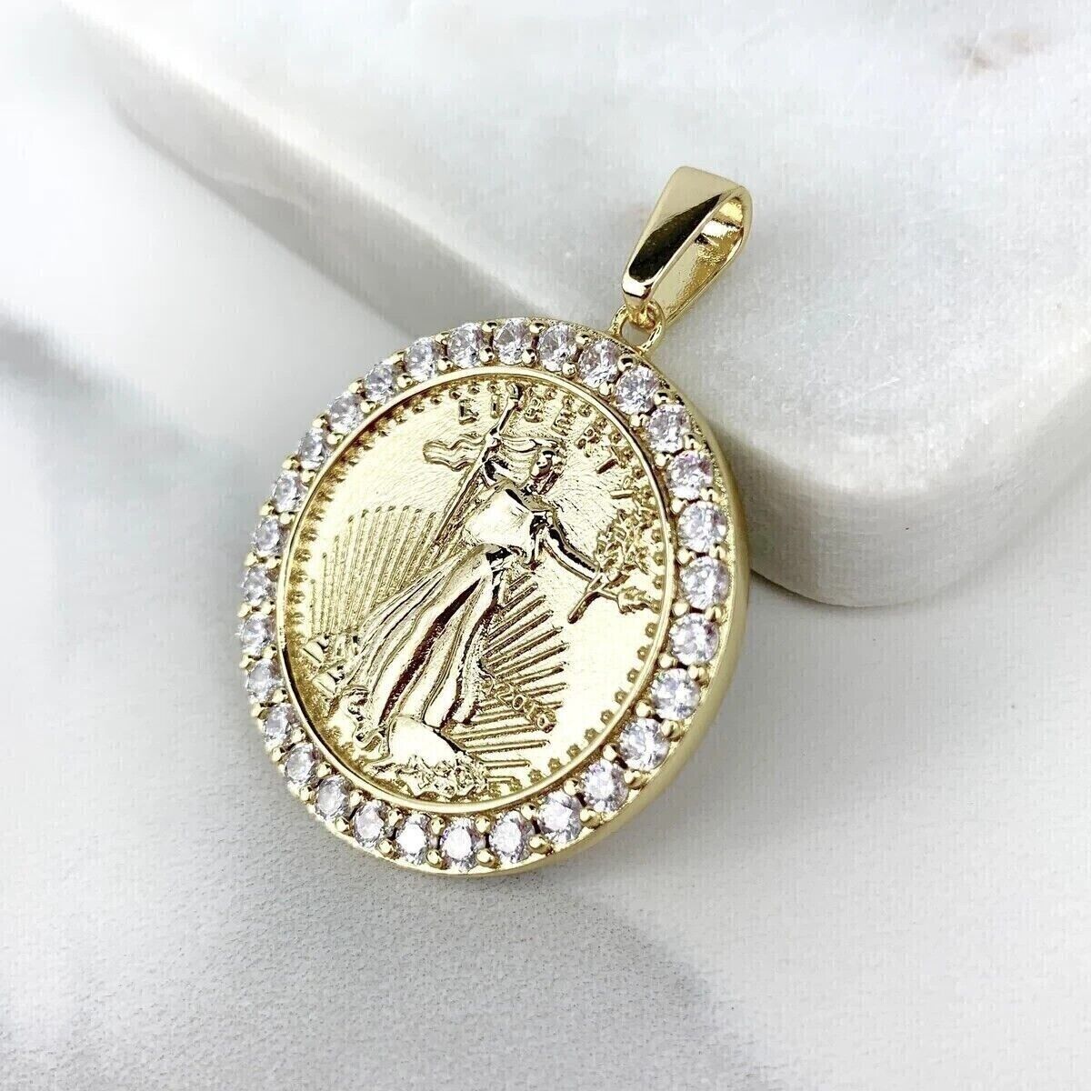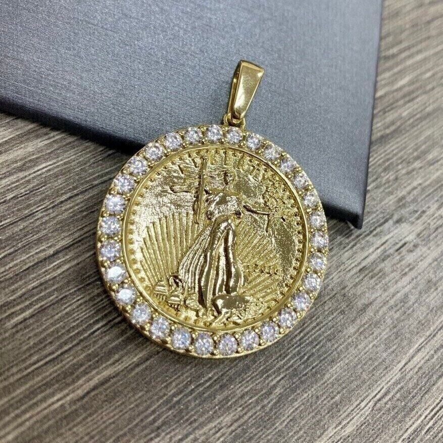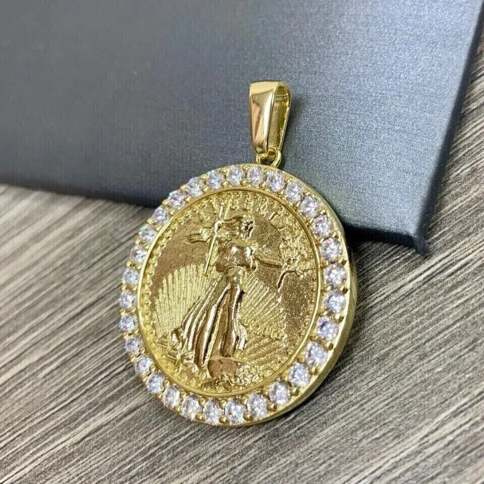2Ct Round Simulated Moissanite Lady Liberty Coin Pendant 14k Yellow Gold Plated