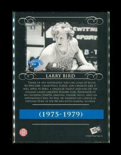 2008 PRESS PASS LEGENDS Basketball Trading Card #43 LARRY BIRD (1975-1979) Indiana State University Sycamores, Drafted Boston Celtics