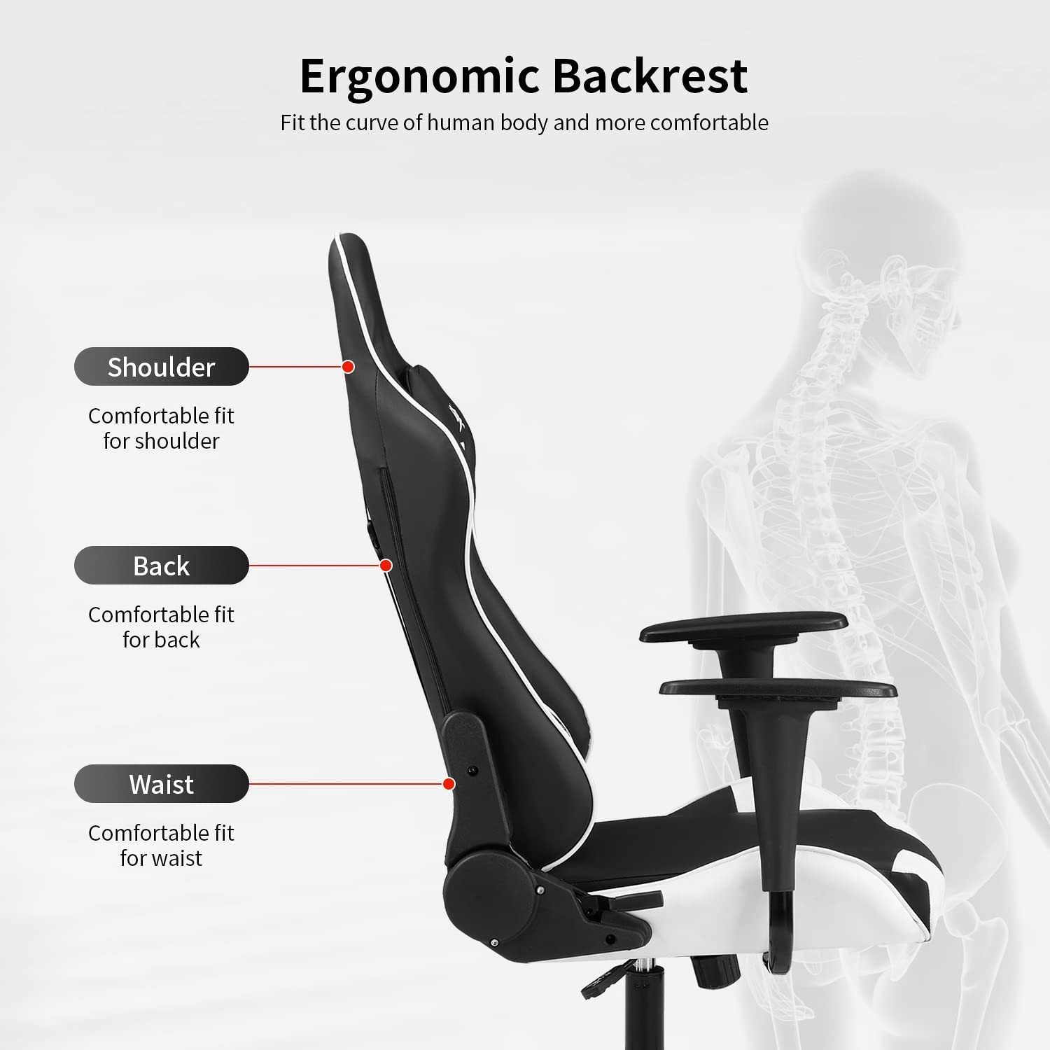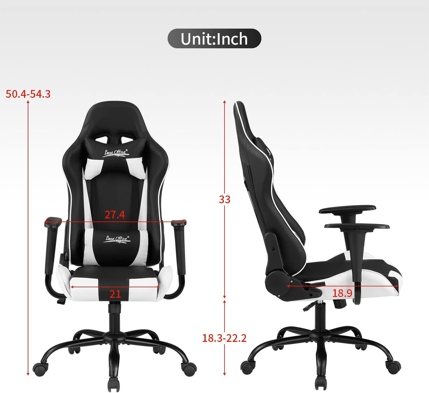 ?Easy To Set UP - For office chair we have detailed installation instructions and presented the necessary installation tools, enable everyone to quickly assemble into a gaming chair. Estimated assembly time in about 10-30mins. ?Comfortable Seating - Gaming chair ergonomic curved high back perfectly supports your whole body very well, thick cushion padded with high density shaping sponge that soft and comfortable for long time use. In the meantime, racing chair backrest locking in any position when you recline, have the safe angle 90-135 degree. ?Ergonomic Lumbar Cushion Headrest - Gaming chair have nice dainty embroidery, more fashion and relax. Desk chair does include a weight limit of 250 pounds. ?360 Rotating - Smooth PU leather of the desk chair, thickness seat cushion, and lumbar headrest pillows offered support and comfort. Heavy-duty metal base and nylon smooth-rolling casters for great stability and mobility. ?Good Quality - All of our chair?s accessories pass the test. If you?re not satisfied with this gaming chair, please get in touch with us. The seat height can be adjusted from 18.3"-22.2" and the seat measures 21"(W)*18.9"(D).