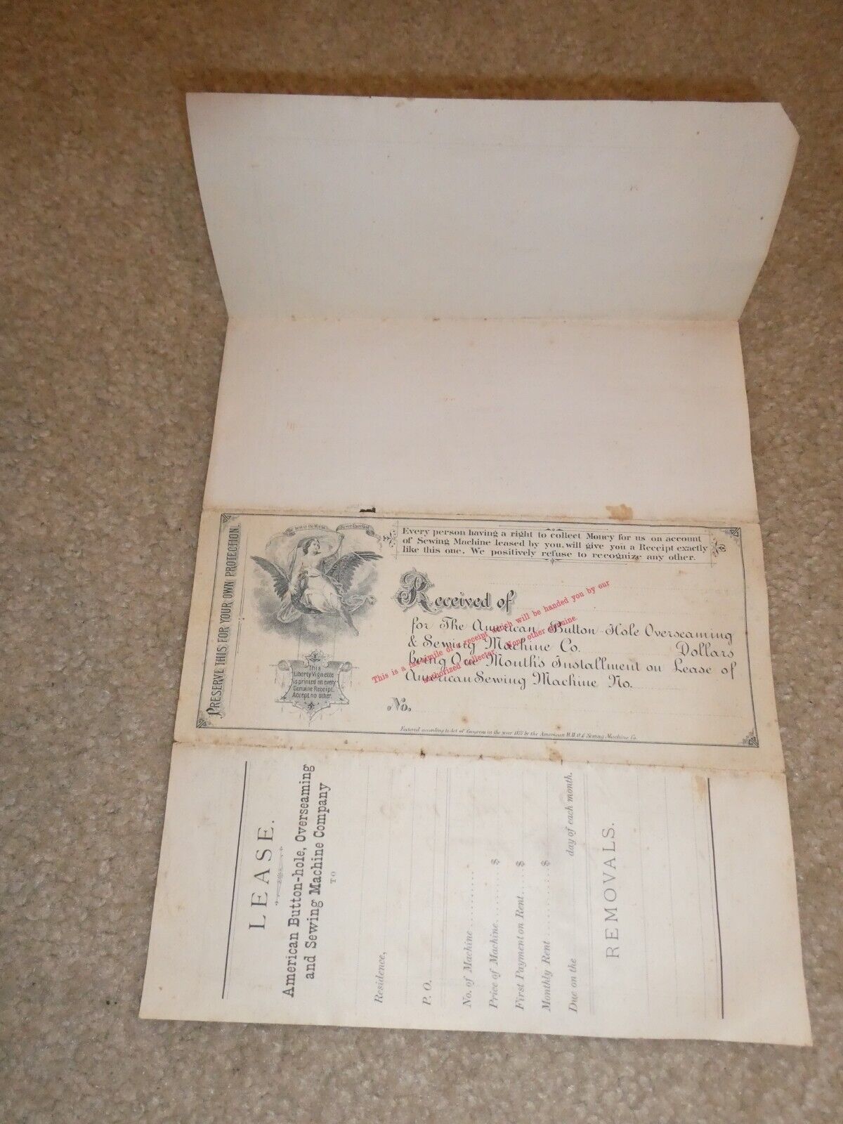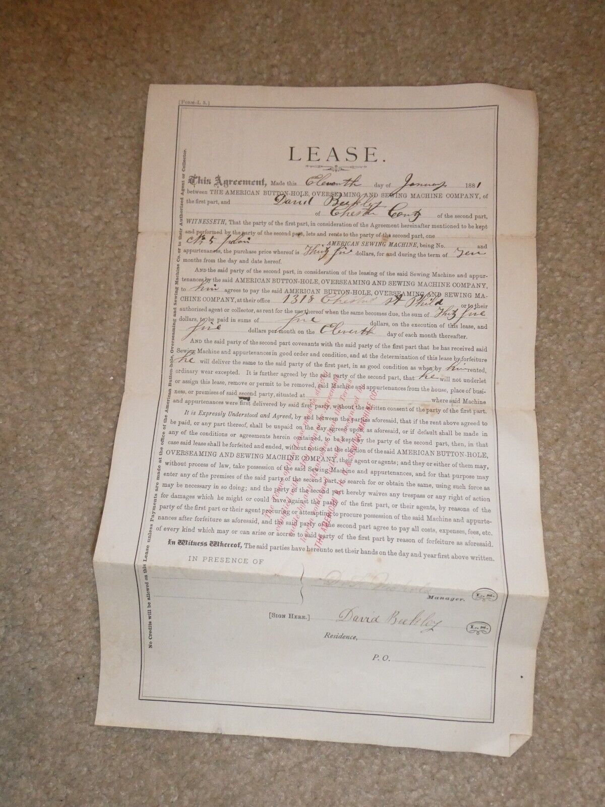 are bidding on an estate sale find, dated January 11 1881, an original lease between the American Button Hole, Overseaming and Sewing Machine Company and Daniel Berkley in Chester County Pennsylvania. Super cool old piece. Very good shape, folds, light browning, light general wear as shown, neat piece to frame. Zoom in for details.