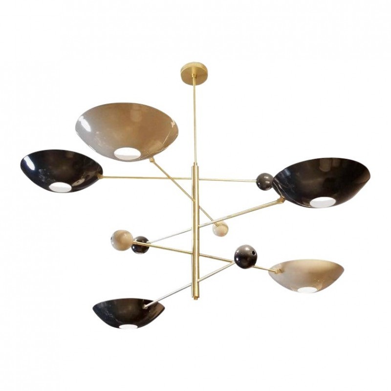 Handcrafted in NYC by Blueprint Lighting, our 'Catalonia' Chandelier is a commanding statement piece with design elements of both Italian and French modernism and is a stunning study in balance and equilibrium. Floor sample available to view at our NYC showroom in Chelsea. The height, drop rod, and wing span can be adjusted to suit any room. Shown with 5 tiers. All arms of this chandelier are articulated with approximately a 320-degree horizontal rotation. Total height with drop as pictured is 41.5", but drop rod length can be customized to suit your space. The body of chandelier as shown is 22" tall with a 52" diameter when fully extended. Spun aluminum discs are 12" diameter and 3" deep. Length of each arm as shown (from the tip of the round finial to the end of the disc) is 39". Shown in our "Gray" and "Intrepid" enamels with a natural brass frame. The frame is shown in natural brass, but may be made in any metal finish including antique, brushed or mirrored brass, bronze, mirrored or brushed nickel, matte black, oil-rubbed bronze, etc. Uses five (5) E26 standard socket bulbs (globe shape recommended) up to 60 watts each or retrofit socket LED bulbs