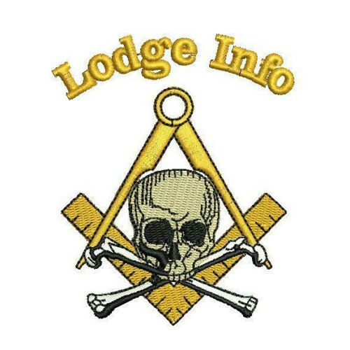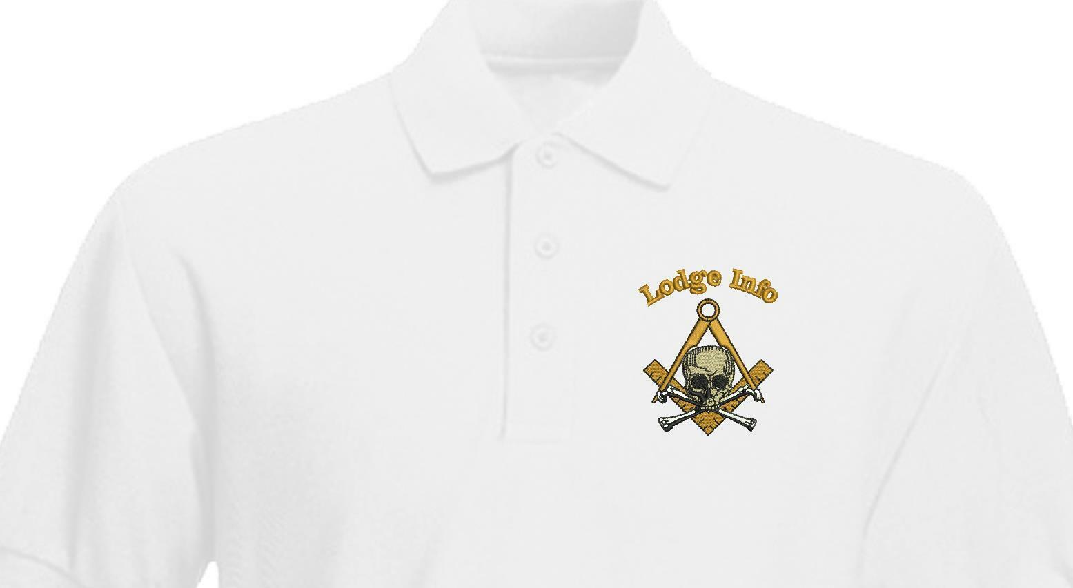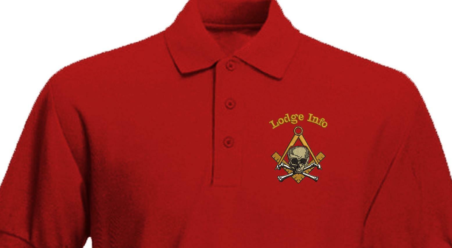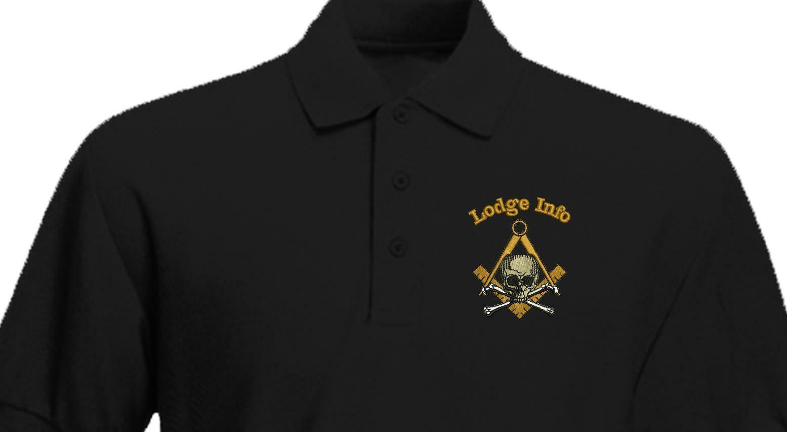 One Men's Polo Shirt with embroidered Masonic Compass, Square and Scull design as shown on images plus an optional Lodge Info*