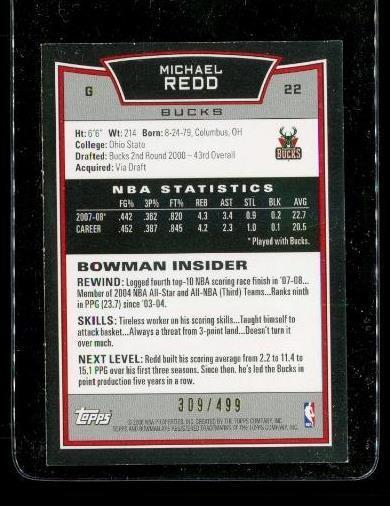 2007-08 TOPPS BOWMAN Basketball Card #22 MICHAEL REDD Milwaukee Bucks Limited Edition 309/499
