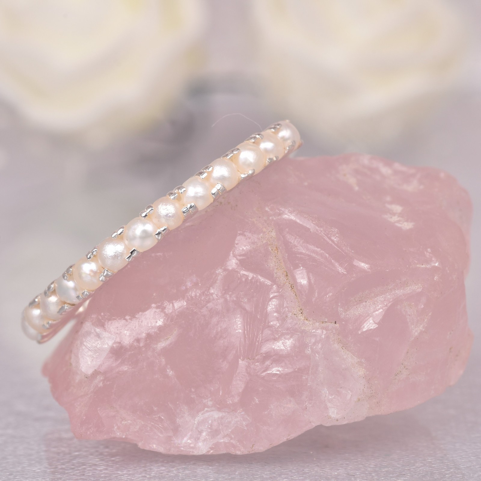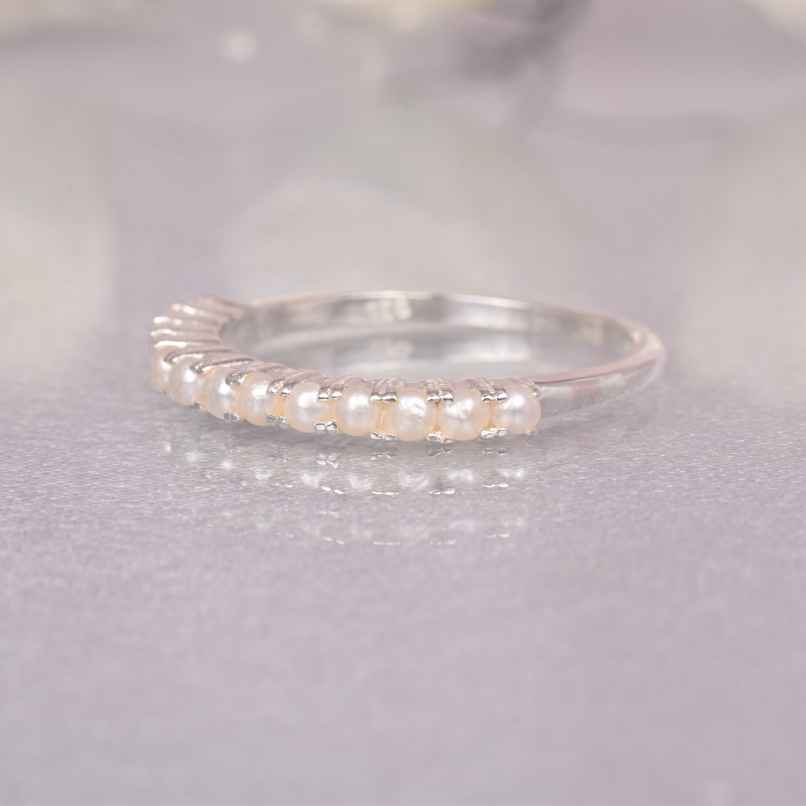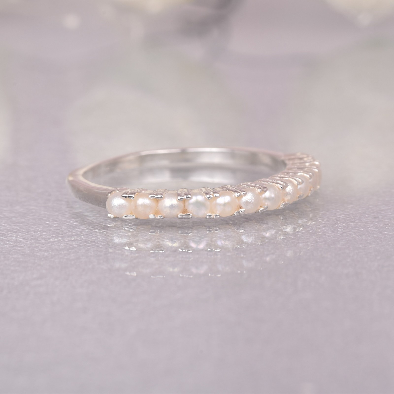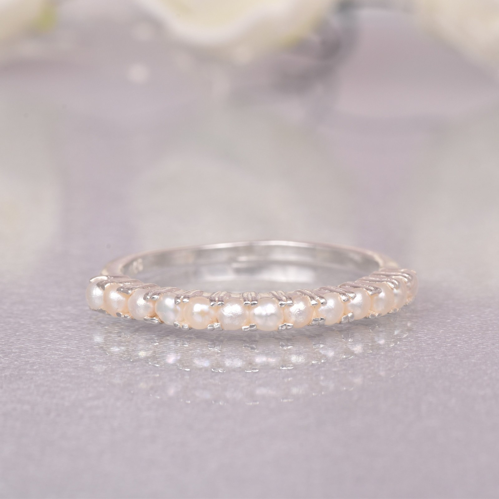 Natural White Pearl Gemstone Sterling Silver Half Eternity Band Ring Jewelry