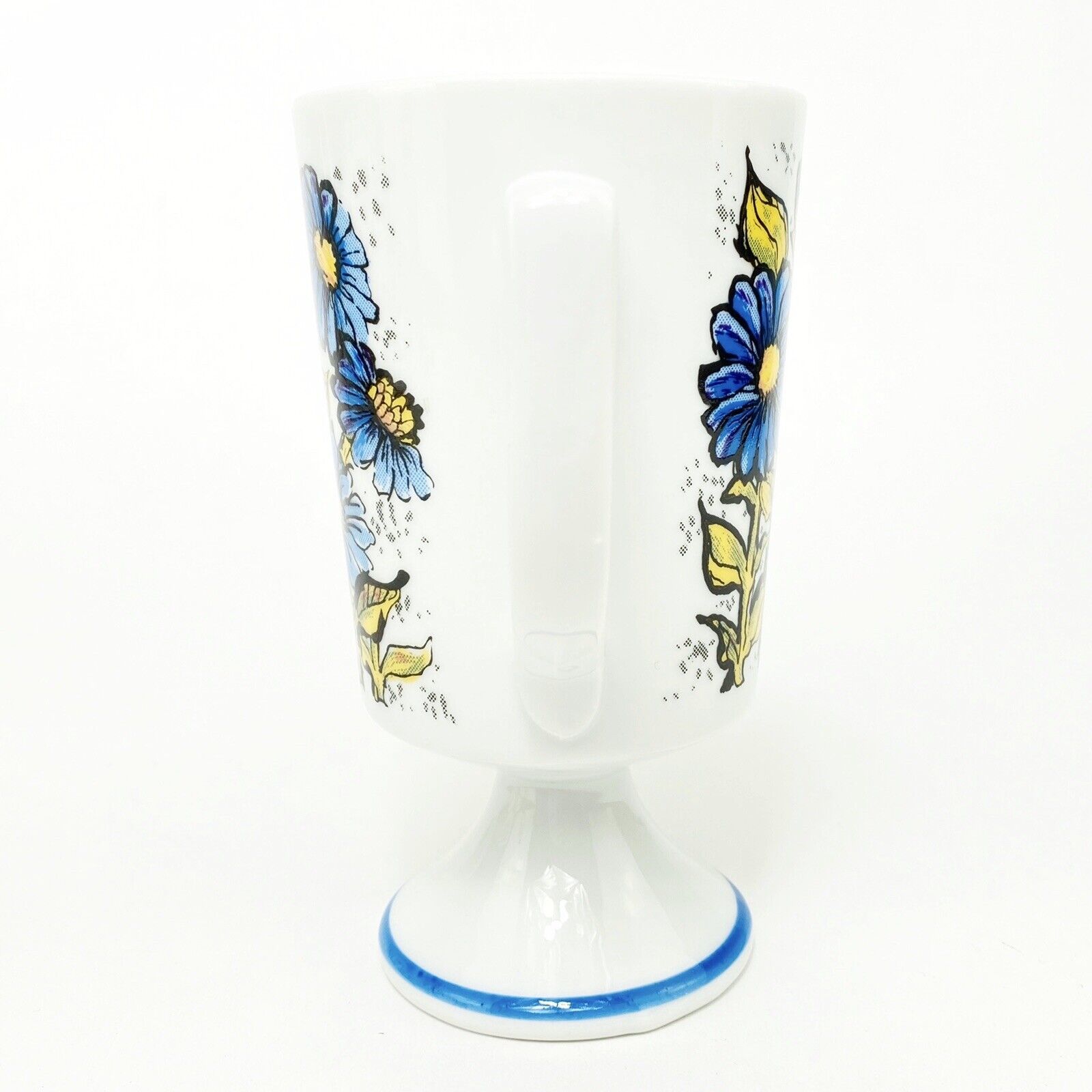 Vintage Coffee Mug Footed w/ Summer Floral Decoration Blue Daisys Flowers Cup