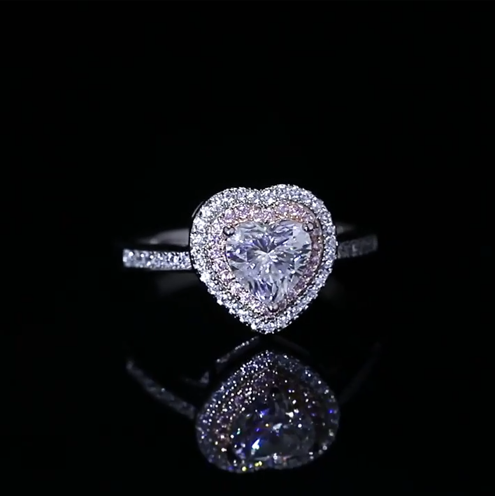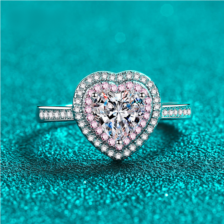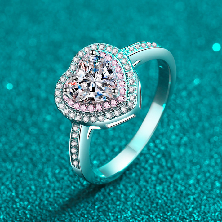 Platinum 925 Sterling Silver 1CT Heart Cut Moissanite Gemstone Pink Inlaid Ring