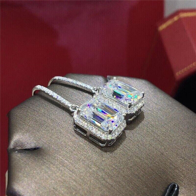 5Ct Emerald Cut Moissanite DropDangle Halo Earrings 14K White Gold Plated Silver