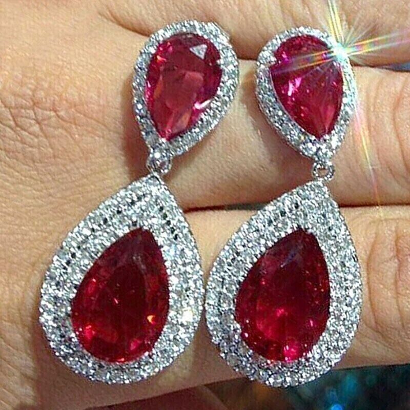 6.20Ct Pear Simulated Red Ruby Drop Dangle Earrings 14K White Gold Plated Silver
