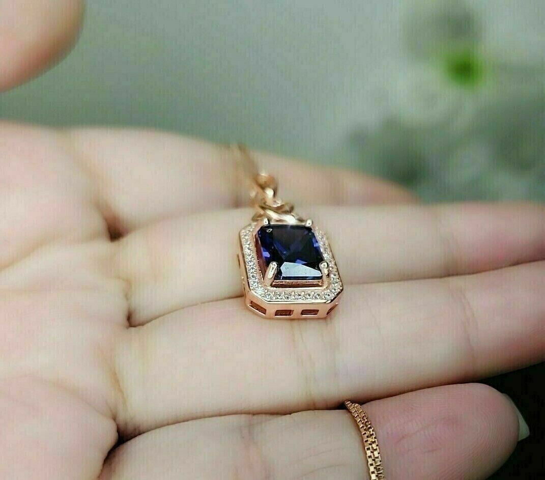 2Ct Emerald Simulated Blue Sapphire Halo Pendant 14K Rose Gold Plated Silver