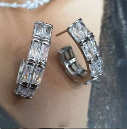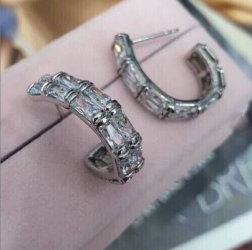 Delicated 3Ct Baguette Cut Moissanite Hoop Earrings 14K White Gold Plated Silver