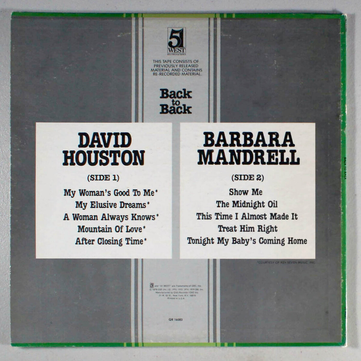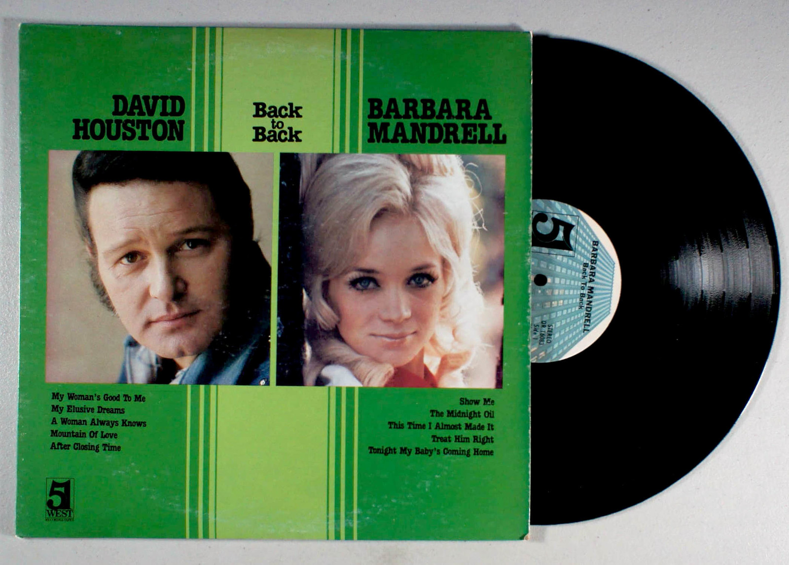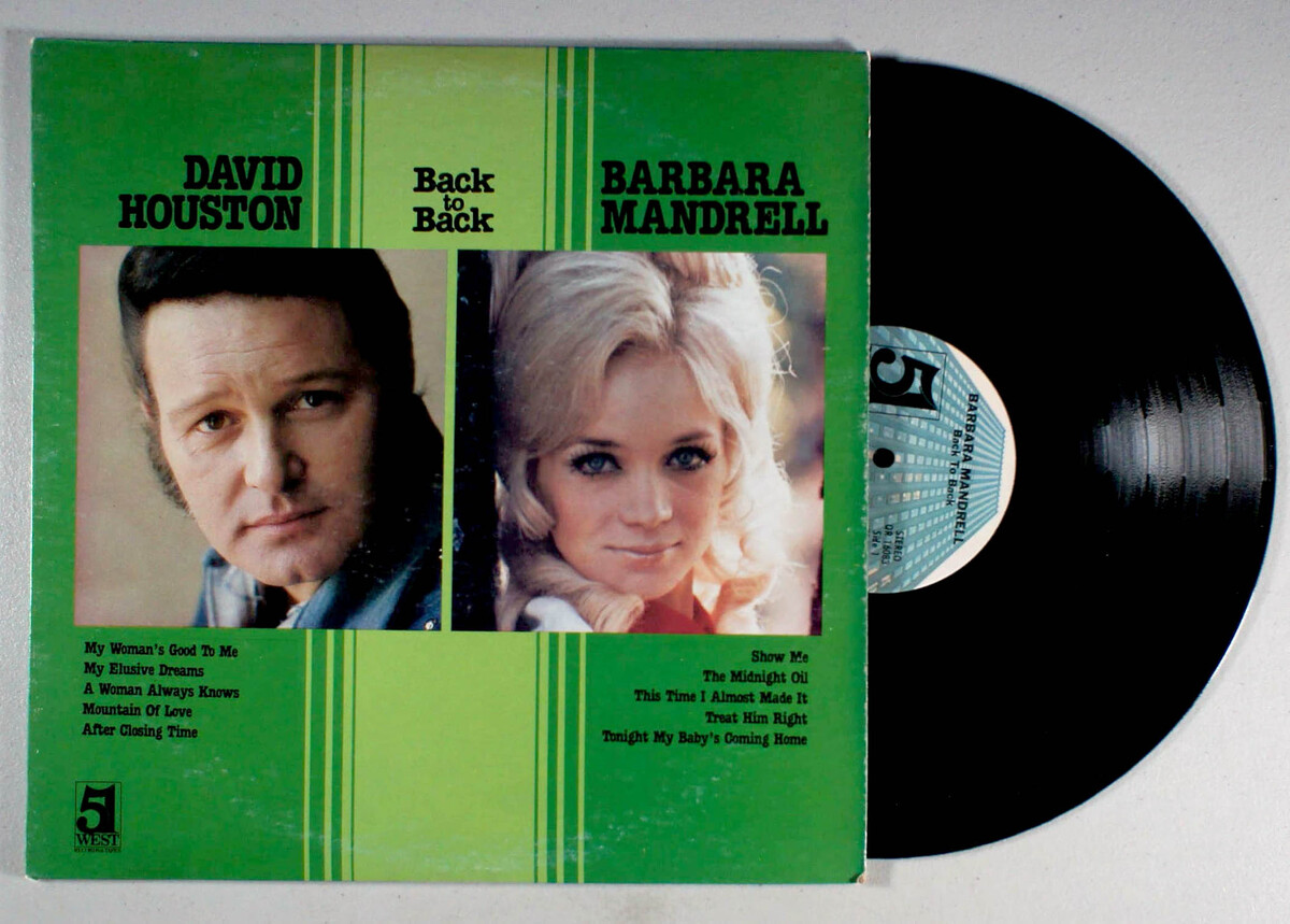 Back to Back, by David Houston and Barbara Mandrell, is a mash-up of sorts featuring five Hits by Houston on side 1 and Mandrell on side 2. All the songs on the album charted within the Top 20 on the country charts.