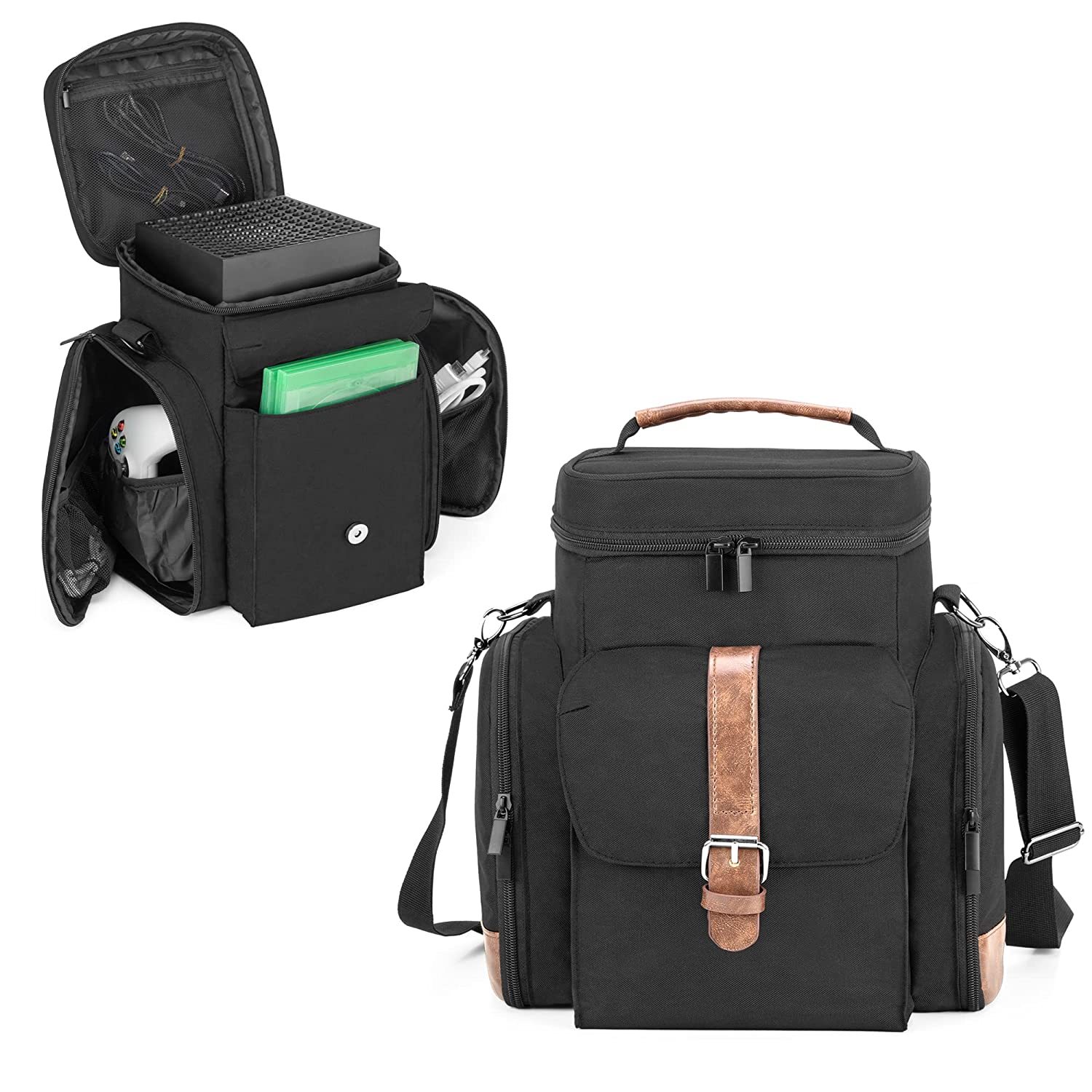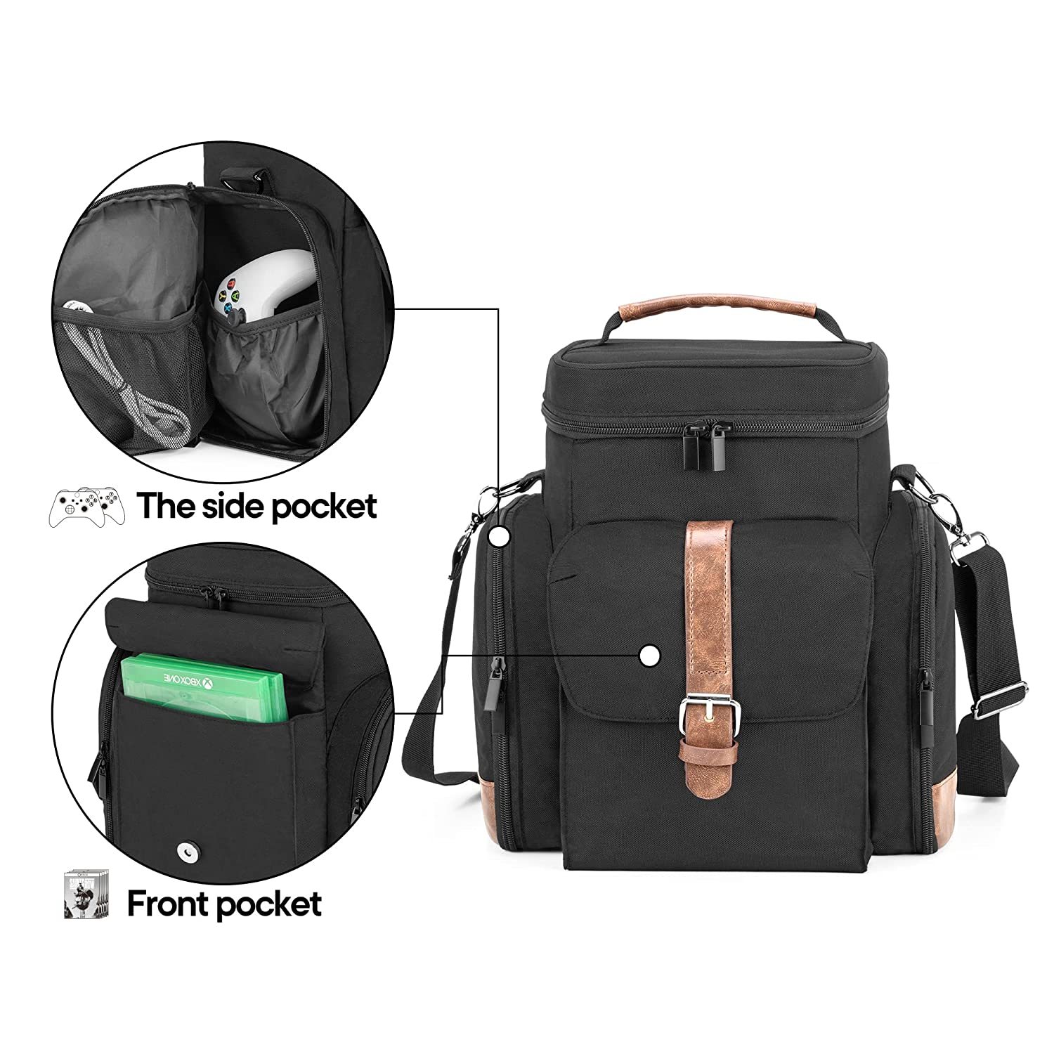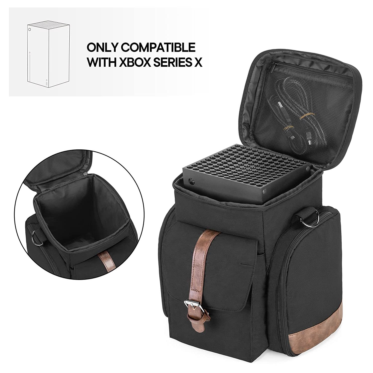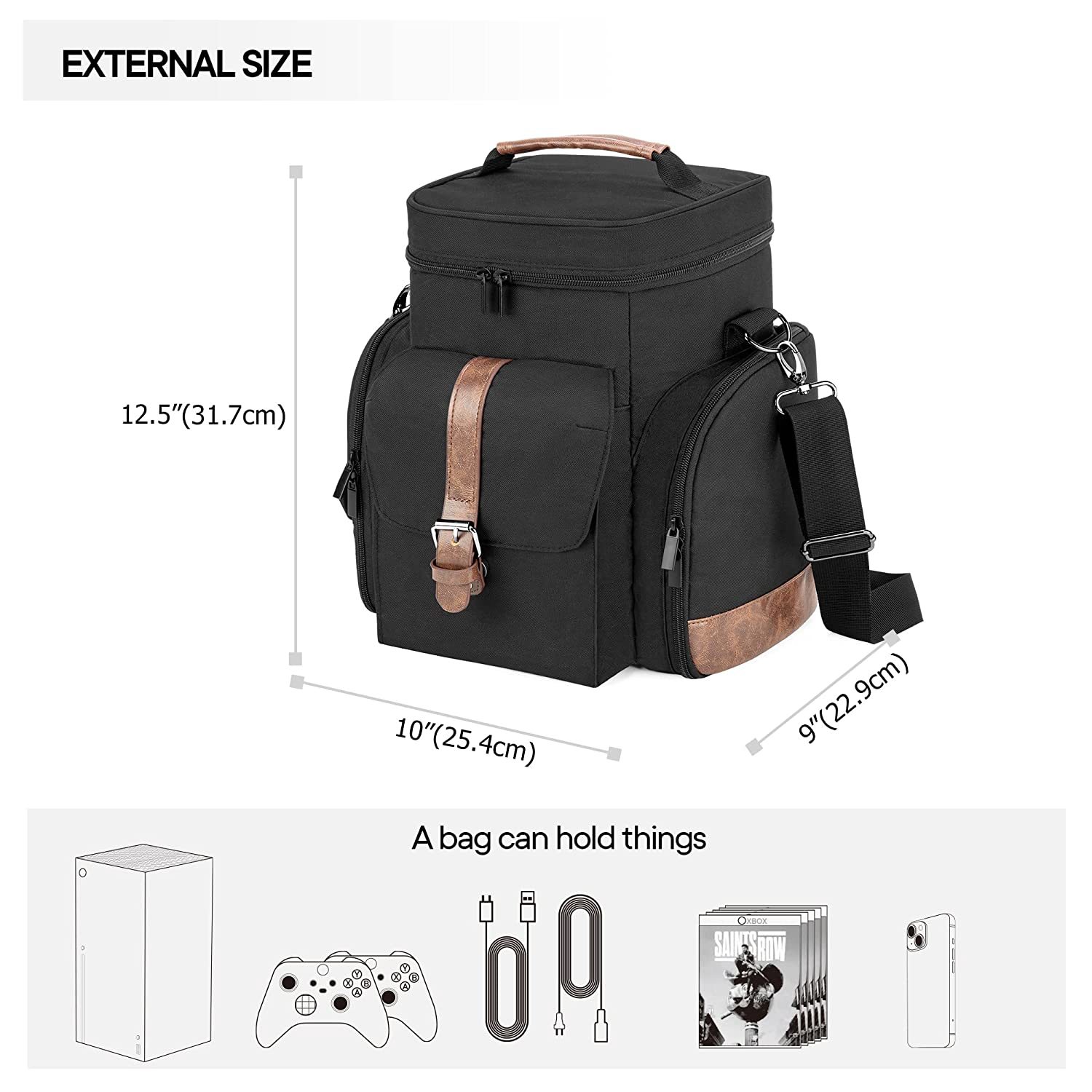 ?ALL-AROUND PROTECTIVE?: The game storage case size is 10?*9?*12.5?. The main compartment with around and bottom pearl cotton, which can protect the game equipment from bumping. NOTE: BAG ONLY ?TARGETED DESIGN?: This game travel carrying bag is compatible with Xbox Series X, which is a targeted design for the game console and accessories, and the main compartment size is 6.3?*6.7?*11.02?. ?MULTIPLE POCKETS?: Two sides are elastic and mesh pockets, which can put your game controller and accessories, and other pockets on top and front can allow you to take more items to transport. ?EASY TO CARRY?: A handle on the top and an adjustable padded shoulder strap can be more comfortable for you to take it everywhere, or reduce your hands by using the shoulder strap. ?DURABLE AND ANTI-SLIP BOTTOM?: A whole anti-slip bottom also is a waterproof material, and easy to clean, it will make you rest assured to set on anywhere.