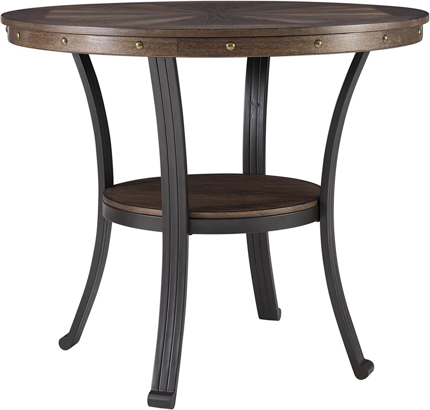 Mixing metal with wood, the transitional Franklin side table provides a unique addition to your home. The round table features an oak woodgrain veneer with nail heads along the apron. The sturdy metal base is made of curved legs and includes a Small circular shelf. Some assembly required.