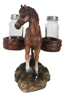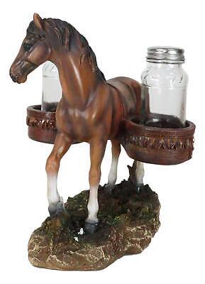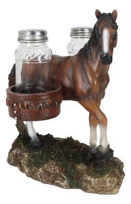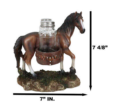 ? Giddy up and saddle up cowboys with this western salt and pepper shakers holder. This salt and pepper shakers holder is designed in the horse with saddle theme. The horse with saddlebags takes the center part of the sculpture. The 2 saddlebags has a faux tooled leather finishing that will hold your glass shakers.