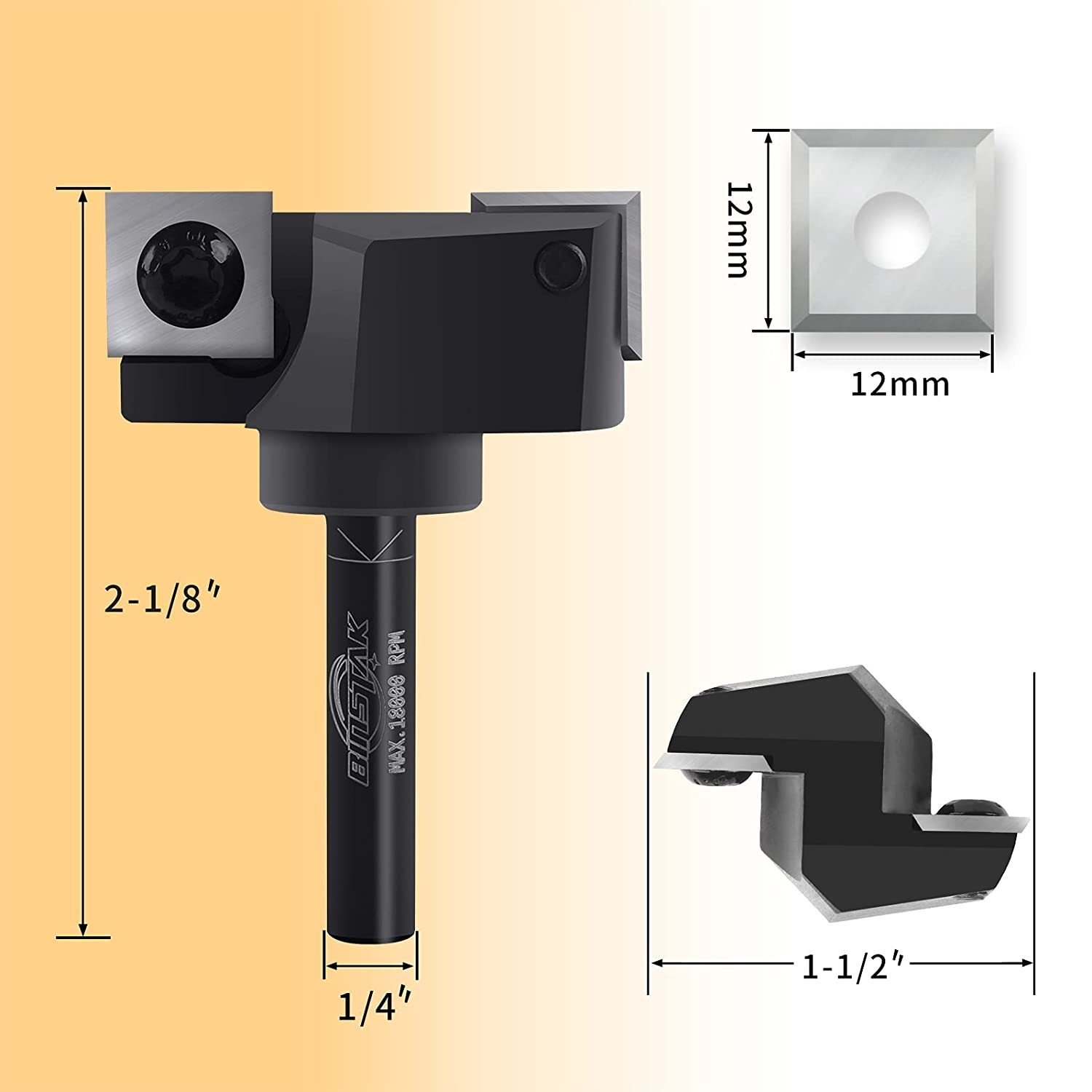 2-WING INSERT CNC ROUTER BIT: Shank: 1/4"; Cut Diameter: 1-1/2" ; Carbide Inserts: 12*12mm. 2-wing design, resulting in a more balanced tool while running. INDUSTRIAL GRADE CNC WOOD ROUTER BIT: Super-strength steel body with anti kickback design, 2 cutting blades. COST-EFFECTIVE INSERT BIT: The surfacing router bit utilizes 4-sided solid carbide inserts. All 4 edges of carbide inserts can be used, use a screwdriver to make other blade edge outside. Replace the carbide inserts when needed, instead of replacing the whole bit. Cost effective solution compared to brazed router bits and solid carbide spiral bits. This planer router bit is perfect for wood slabs flattening, resurface or plane the top surface of the spoilboard. Used on soft and hard woods, particle board, MDF, plywood compact panel, laminate, acrylic and etc. Use on CNC and other automatic routers as well as hand-held and table-mounted portable routers. Such as woodworking engraving machine, trimming machine, etc.