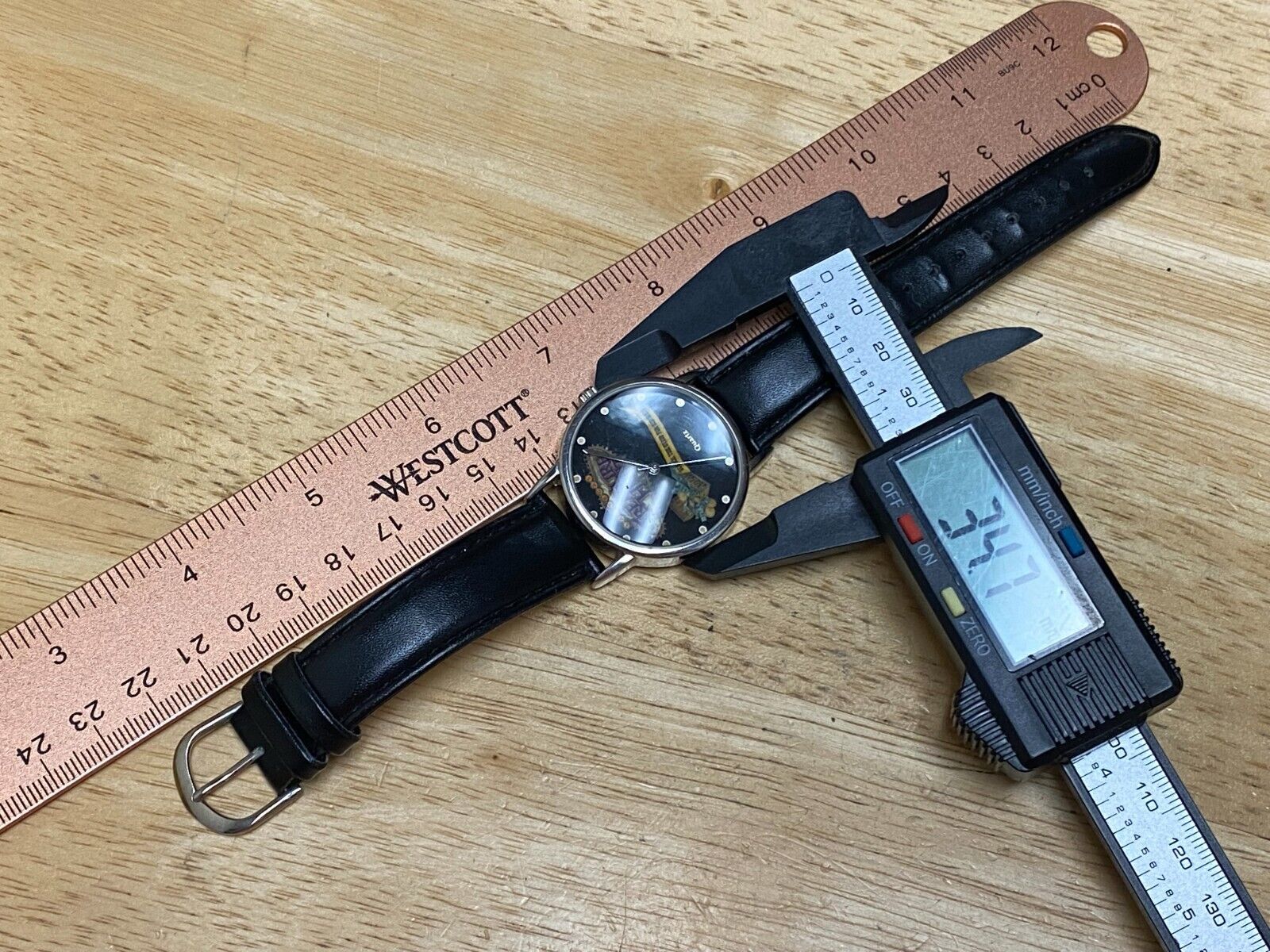Watch dimension and size: please review the last image for size measurements. Shown on caliper is the approximate watch width in mm without crown or button.