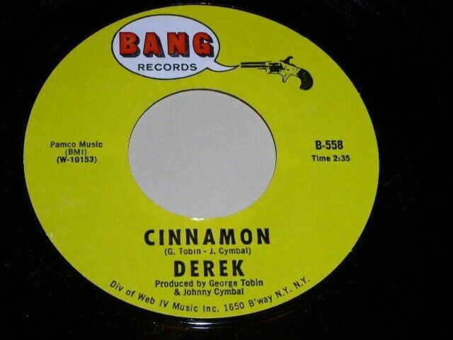 This is an original, vintage 45 rpm phonograph record by Derek entitled, "Cinnamon". Flipside: "This Is My Story". Record label Bang 558.