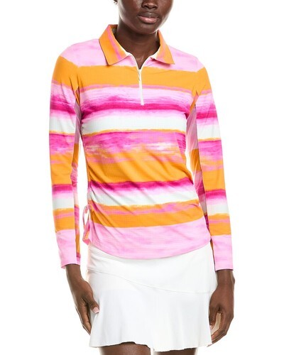 It has a zip placket, a polo collar mesh running under the arms. There are ties on the sides so that it can be adjusted. The ICE FIL fabric is 92% Nylon 8% Polyurethane which is designed to keep you cool. It is soft and stretchy, wicks the moisture from sweat, has 50+ UPF sun protection, is fast drying and retains it shape after washing.
