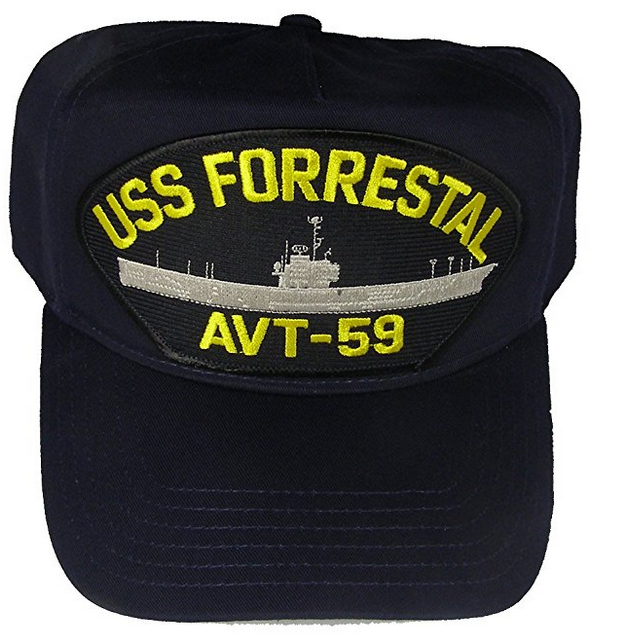 USS FORRESTAL AVT-59 HAT - LARGER PATCH SIZE Approx 6" x 3 1/4" - Adjustable Size, Navy Blue Golf Style Hat. Veteran Owned and Operated Business